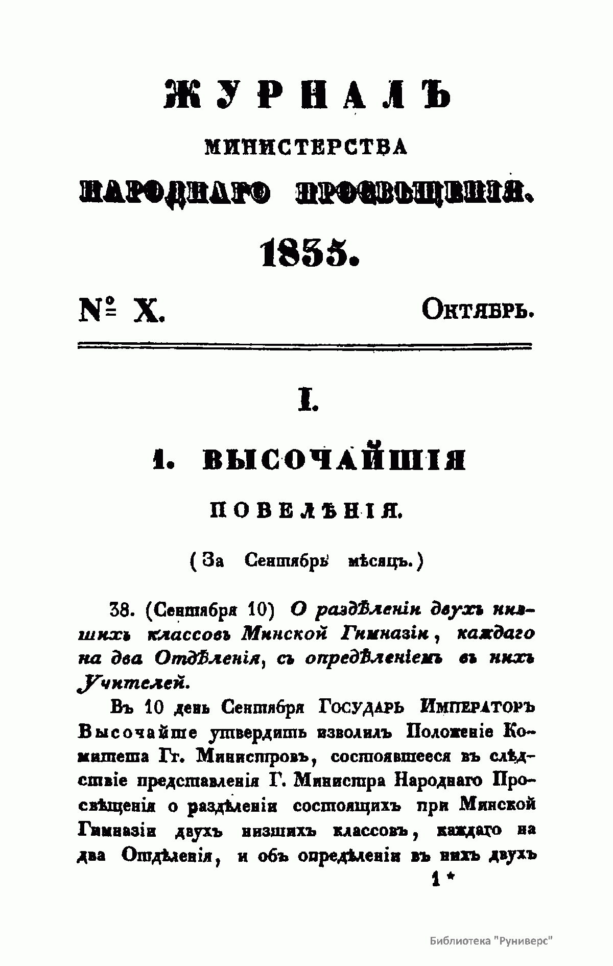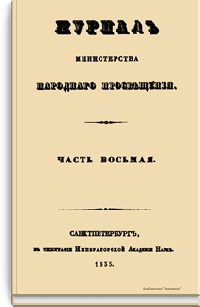 Журнал Министерства народного просвещения выходил с 1834-го по 1917 год. Официальный периодический журнал об успехах просвещения в России. Издатели журнала уверены в том, что «если для каждого человека необходим выход из грубой тьмы невежества и беспрерывное дальнейшее движение к свету, то для народов необходимо попечительное участие правительства в образовании. Только правительство имеет все средства знать и высоту успехов всемирного образования, и настоящие нужды Отечества».