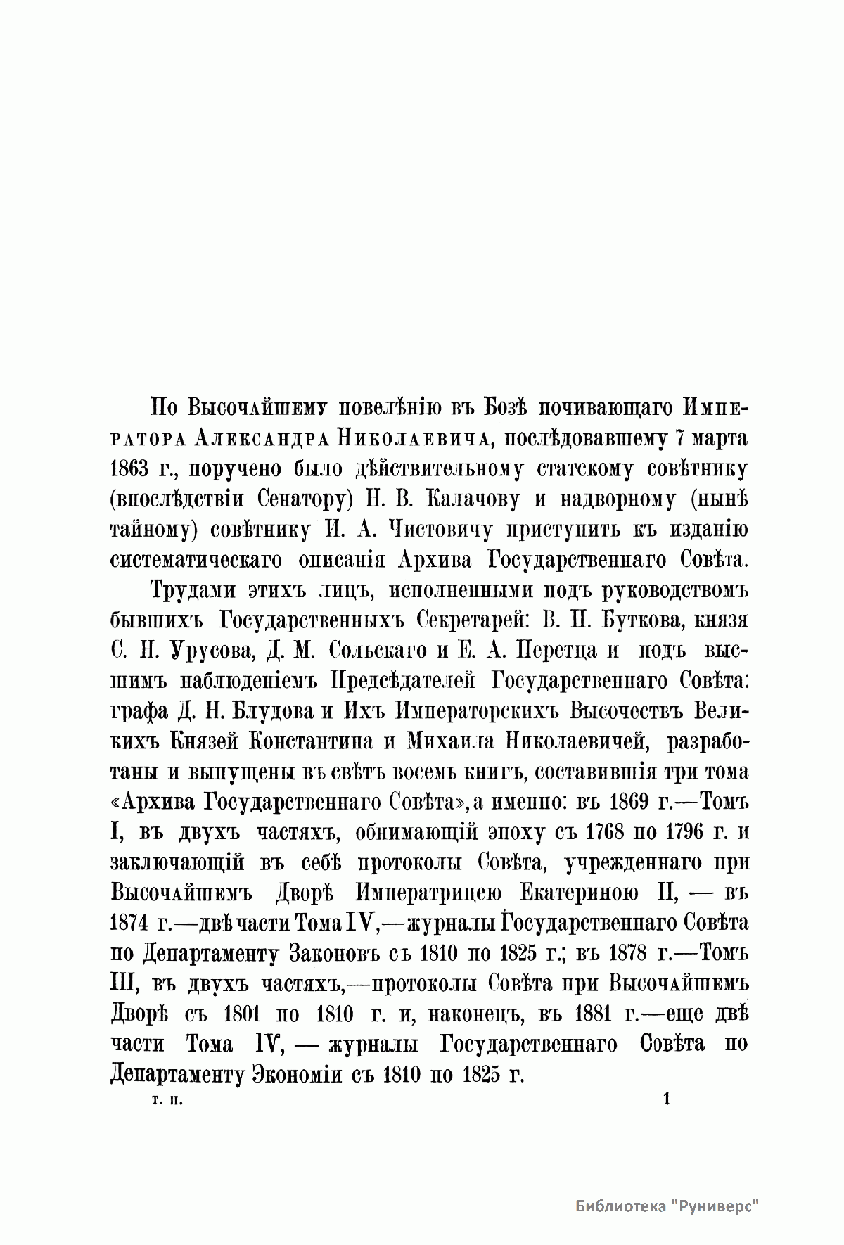В 1863 г. по высочайшему повелению Александра II началась работа над систематическим описанием архива Государственного совета и Государственной канцелярии. Эта работа была поручена сенатору, историку-юристу Н. В. Калачову и советнику И. А. Чистовичу под высшим наблюдением председателя Государственного совета Д. Н. Блудова. Под их редактурой вышли в свет три тома (восемь книг) «Архива государственного совета»: две части первого тома, охватывающие период с 1768 по 1796 г. и заключающие в себе протоколы Совета, учрежденного императрицей Екатериной II; две части четвертого тома, содержащие журналы Государственного совета по Департаменту законов с 1810 по 1825 г.; две части третьего тома, в которые вошли протоколы Совета при Высочайшем дворе с 1801 по 1810 г.; две части четвертого тома, включающие журналы Государственного совета по Департаменту экономии с 1810 по 1825 г. Со смертью главного редактора издания сенатора Калачова публикация архива была приостановлена. С учетом исторической ценности данного труда, в 1886 г. последовало высочайшее повеление продолжить работу над изданием. Его составление и редактирование было возложено на члена Археографической комиссии Министерства народного просвещения Г. Ф. Штендмана, помощника статс-секретаря Государственного совета П. М. фон Кауфмана и др. В продолжение работы над изданием были опубликованы: третья часть четвертого тома, содержащая материалы по гражданскому отделению Департамента законов (1818–1820); пять частей четвертого тома, в который вошли журналы по Департаменту гражданских и духовных дел (1810 – 19 ноября 1825 г.); первая часть пятого тома, включающая журналы по делам Департамента государственной экономии (20 ноября 1825 г. – 1826).