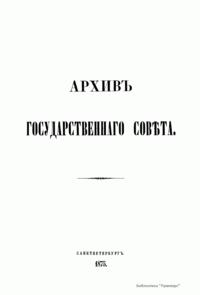 В 1863 г. по высочайшему повелению Александра II началась работа над систематическим описанием архива Государственного совета и Государственной канцелярии. Эта работа была поручена сенатору, историку-юристу Н. В. Калачову и советнику И. А. Чистовичу под высшим наблюдением председателя Государственного совета Д. Н. Блудова. Под их редактурой вышли в свет три тома (восемь книг) «Архива государственного совета»: две части первого тома, охватывающие период с 1768 по 1796 г. и заключающие в себе протоколы Совета, учрежденного императрицей Екатериной II; две части четвертого тома, содержащие журналы Государственного совета по Департаменту законов с 1810 по 1825 г.; две части третьего тома, в которые вошли протоколы Совета при Высочайшем дворе с 1801 по 1810 г.; две части четвертого тома, включающие журналы Государственного совета по Департаменту экономии с 1810 по 1825 г. Со смертью главного редактора издания сенатора Калачова публикация архива была приостановлена. С учетом исторической ценности данного труда, в 1886 г. последовало высочайшее повеление продолжить работу над изданием. Его составление и редактирование было возложено на члена Археографической комиссии Министерства народного просвещения Г. Ф. Штендмана, помощника статс-секретаря Государственного совета П. М. фон Кауфмана и др. В продолжение работы над изданием были опубликованы: третья часть четвертого тома, содержащая материалы по гражданскому отделению Департамента законов (1818–1820); пять частей четвертого тома, в который вошли журналы по Департаменту гражданских и духовных дел (1810 – 19 ноября 1825 г.); первая часть пятого тома, включающая журналы по делам Департамента государственной экономии (20 ноября 1825 г. – 1826).