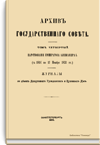 Архивъ Государственнаго совѣта. Томъ четвертый. Совѣтъ въ царствованiе императора Александра I. С 1810 по 19 ноября 1825 г. Журналы по дѣламъ департамента гражданских и духовныхх дѣл. Часть пятая
