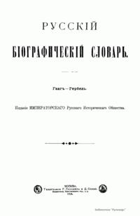 Русский биографический словарь (25 томов), в состав которого вошли имена и биографии виднейших деятелей государства, науки, просвещения и церковных деятелей, издавался Русским историческим обществом с 1896 по 1918 год. Русское историческое общество было основано в Санкт-Петербурге в 1866 году по инициативе известных отечественных историков, военных и государственных деятелей и ставило своей целью всесторонне содействовать развитию русского национального исторического просвещения. Общество пользовалось покровительством и финансовой поддержкой императорской семьи. Его деятельность носила археографический характер. Члены общества собирали исторические документы, которые публиковались в «Сборниках русского исторического общества». Всего до 1920 года (в этом году общество было закрыто) вышло 148 томов. Таким образом в научный оборот было введено большое количество документов XVIII – начала XIX века, ранее недоступных для исследователей, так как документальные материалы архивов царской России были для историков закрыты. К изданию русского биографического словаря, материалы которого до сих пор являются интереснейшим источником для исследователей, Общество приступило по инициативе императора Александра III. Тома биографического словаря выходили не в алфавитном порядке. С 1896 по 1909 год редактором словаря был руководитель Русского исторического общества, промышленник, член Сената Александр Александрович Половцев. Он выпустил 1, 2, 3, 6, 8, 12, 13, 14, 15, 18, 19, 21 и 22-й тома, поэтому этот словарь известен еще как «словарь Половцева».