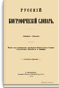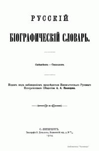 Русский биографический словарь (25 томов), в состав которого вошли имена и биографии виднейших деятелей государства, науки, просвещения и церковных деятелей, издавался Русским историческим обществом с 1896 по 1918 год. Русское историческое общество было основано в Санкт-Петербурге в 1866 году по инициативе известных отечественных историков, военных и государственных деятелей и ставило своей целью всесторонне содействовать развитию русского национального исторического просвещения. Общество пользовалось покровительством и финансовой поддержкой императорской семьи. Его деятельность носила археографический характер. Члены общества собирали исторические документы, которые публиковались в «Сборниках русского исторического общества». Всего до 1920 года (в этом году общество было закрыто) вышло 148 томов. Таким образом в научный оборот было введено большое количество документов XVIII – начала XIX века, ранее недоступных для исследователей, так как документальные материалы архивов царской России были для историков закрыты. К изданию русского биографического словаря, материалы которого до сих пор являются интереснейшим источником для исследователей, Общество приступило по инициативе императора Александра III. Тома биографического словаря выходили не в алфавитном порядке. С 1896 по 1909 год редактором словаря был руководитель Русского исторического общества, промышленник, член Сената Александр Александрович Половцев. Он выпустил 1, 2, 3, 6, 8, 12, 13, 14, 15, 18, 19, 21 и 22-й тома, поэтому этот словарь известен еще как «словарь Половцева».
