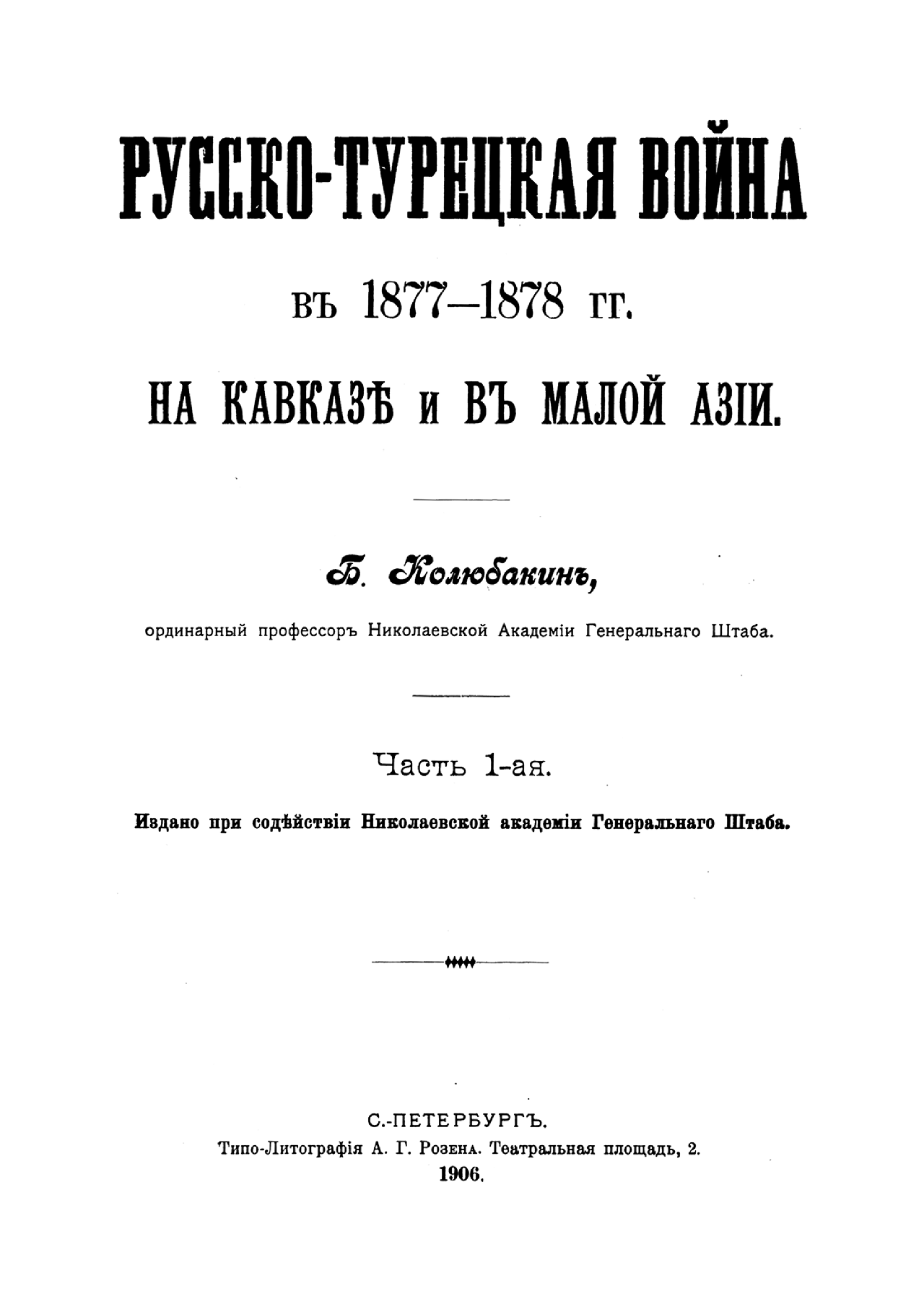 Колюбакин Борис Михайлович (1853–1924) — военный историк и писатель, генерал-лейтенант, участник русско-турецких войн, впоследствии — профессор Николаевской академии Генерального штаба. Его перу принадлежит ряд военно-исторических исследований и работ, большей частью посвященных войне с Турцией. Среди них — «Эриванский отряд в кампанию 1877–1878 гг.», «Воспоминания офицера Кобулетского отряда в кампании 1877–1878 гг.», «Конспект Русско-турецкой войны 1877–1878 гг.».