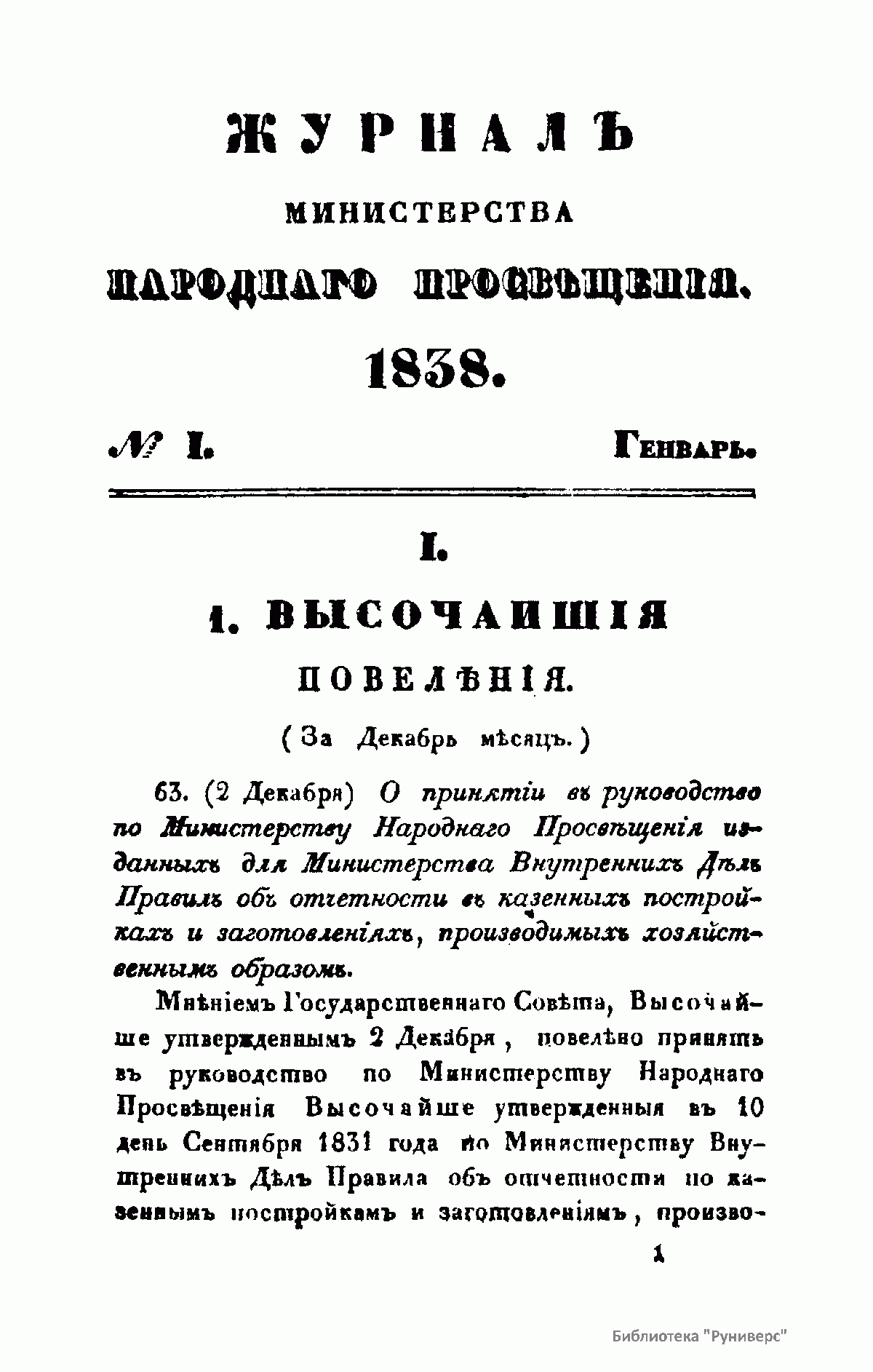 Журнал Министерства народного просвещения выходил с 1834-го по 1917 год. Официальный периодический журнал об успехах просвещения в России. Издатели журнала уверены в том, что «если для каждого человека необходим выход из грубой тьмы невежества и беспрерывное дальнейшее движение к свету, то для народов необходимо попечительное участие правительства в образовании. Только правительство имеет все средства знать и высоту успехов всемирного образования, и настоящие нужды Отечества».
