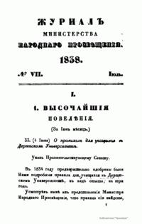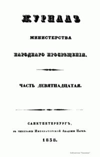 Журнал Министерства народного просвещения выходил с 1834-го по 1917 год. Официальный периодический журнал об успехах просвещения в России. Издатели журнала уверены в том, что «если для каждого человека необходим выход из грубой тьмы невежества и беспрерывное дальнейшее движение к свету, то для народов необходимо попечительное участие правительства в образовании. Только правительство имеет все средства знать и высоту успехов всемирного образования, и настоящие нужды Отечества».