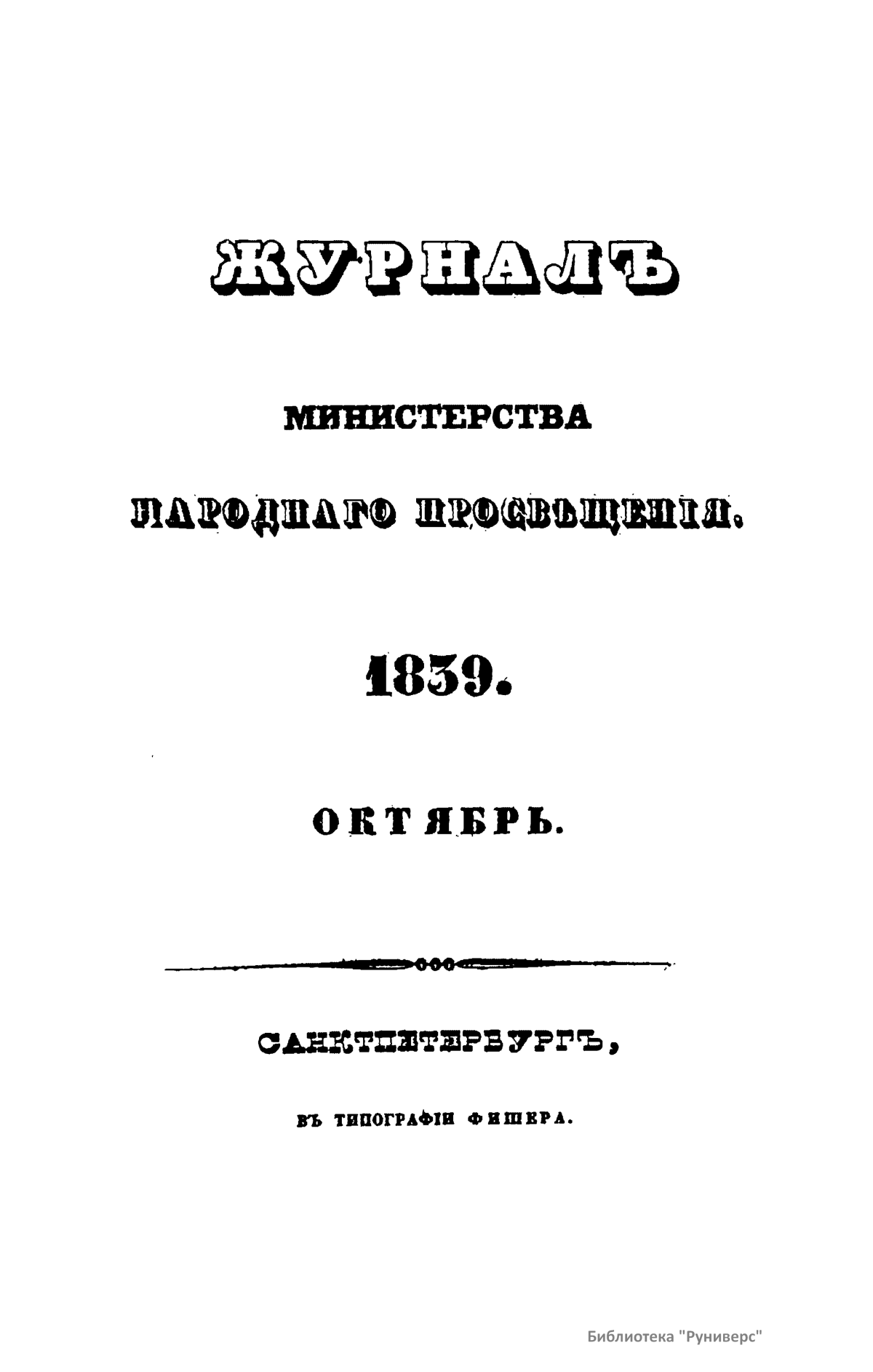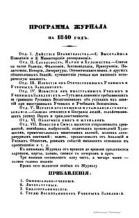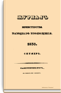 Журнал Министерства народного просвещения выходил с 1834-го по 1917 год. Официальный периодический журнал об успехах просвещения в России. Издатели журнала уверены в том, что «если для каждого человека необходим выход из грубой тьмы невежества и беспрерывное дальнейшее движение к свету, то для народов необходимо попечительное участие правительства в образовании. Только правительство имеет все средства знать и высоту успехов всемирного образования, и настоящие нужды Отечества».