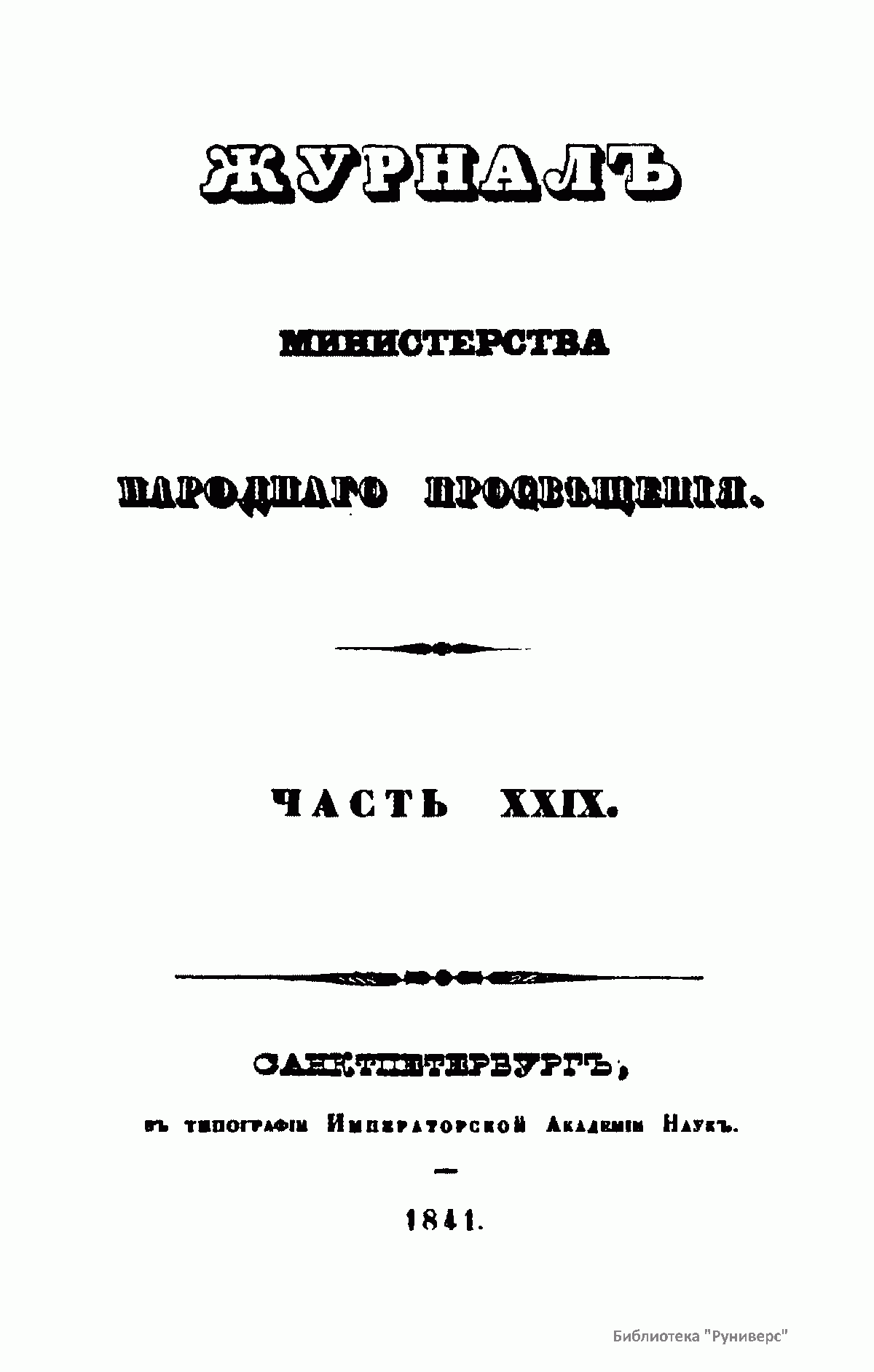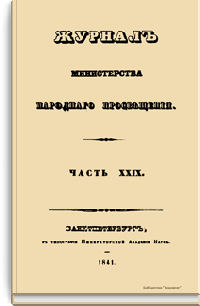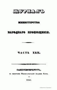 Журнал Министерства народного просвещения выходил с 1834-го по 1917 год. Официальный периодический журнал об успехах просвещения в России. Издатели журнала уверены в том, что «если для каждого человека необходим выход из грубой тьмы невежества и беспрерывное дальнейшее движение к свету, то для народов необходимо попечительное участие правительства в образовании. Только правительство имеет все средства знать и высоту успехов всемирного образования, и настоящие нужды Отечества».