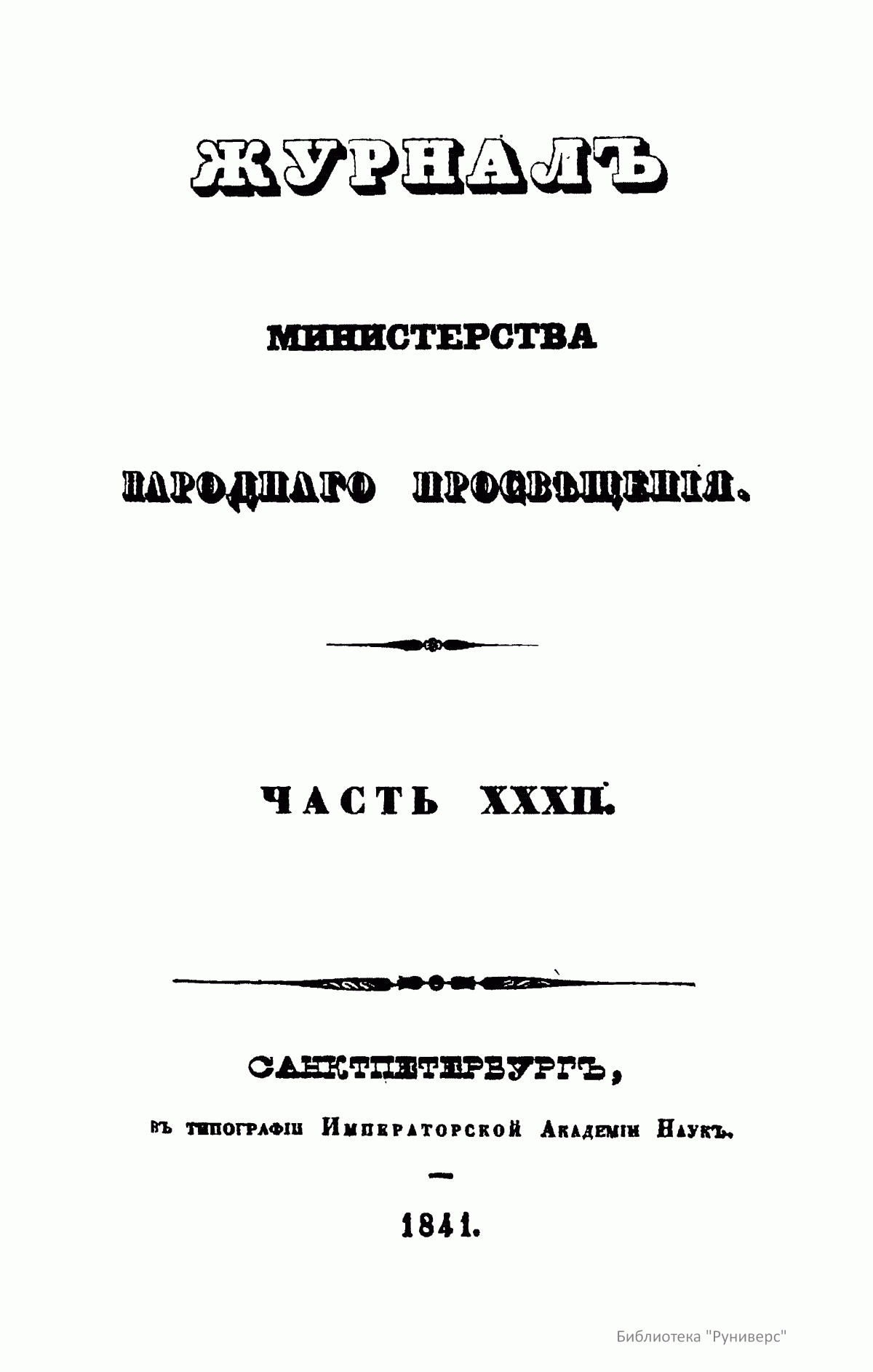 Журнал Министерства народного просвещения выходил с 1834-го по 1917 год. Официальный периодический журнал об успехах просвещения в России. Издатели журнала уверены в том, что «если для каждого человека необходим выход из грубой тьмы невежества и беспрерывное дальнейшее движение к свету, то для народов необходимо попечительное участие правительства в образовании. Только правительство имеет все средства знать и высоту успехов всемирного образования, и настоящие нужды Отечества».