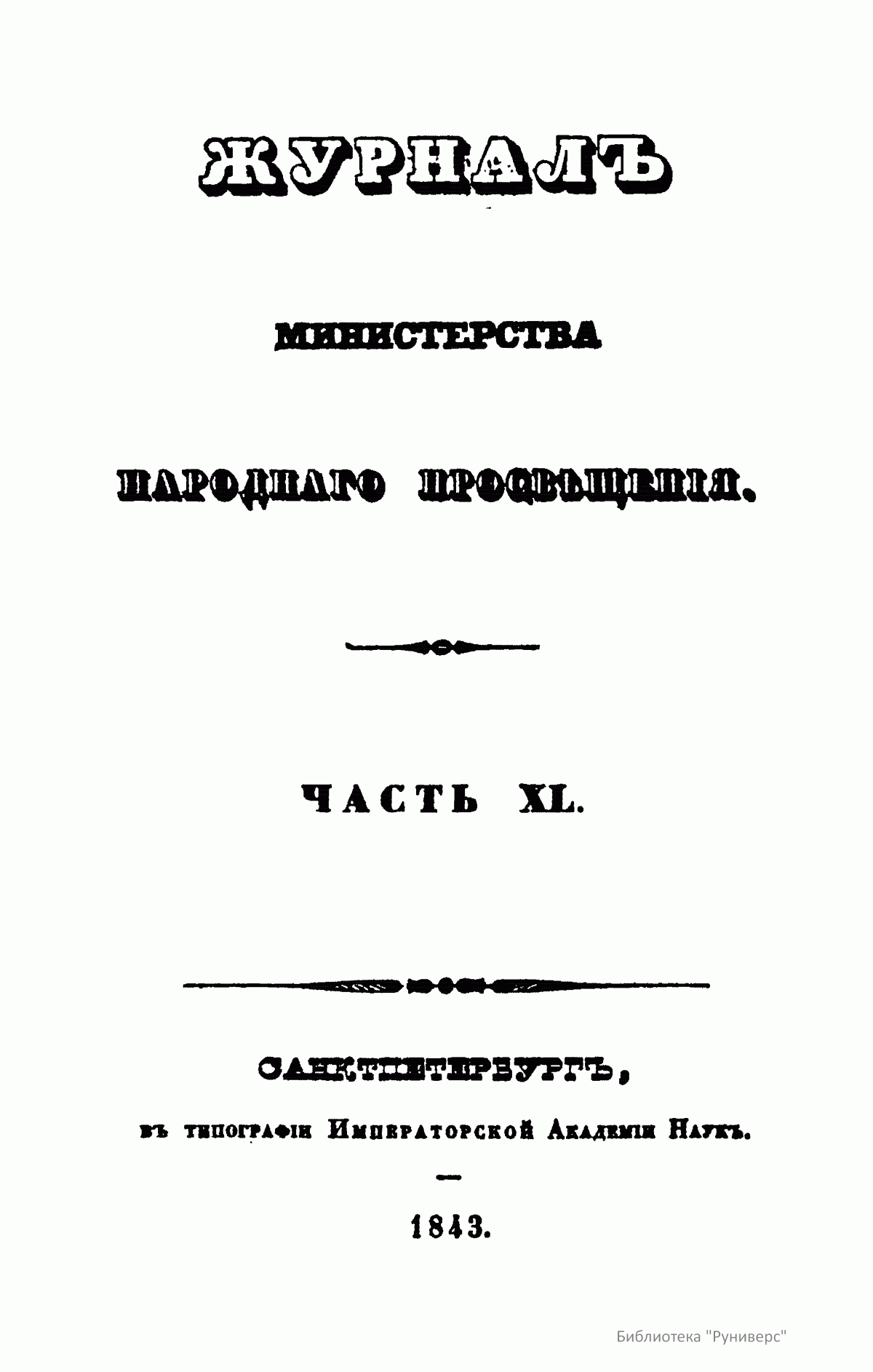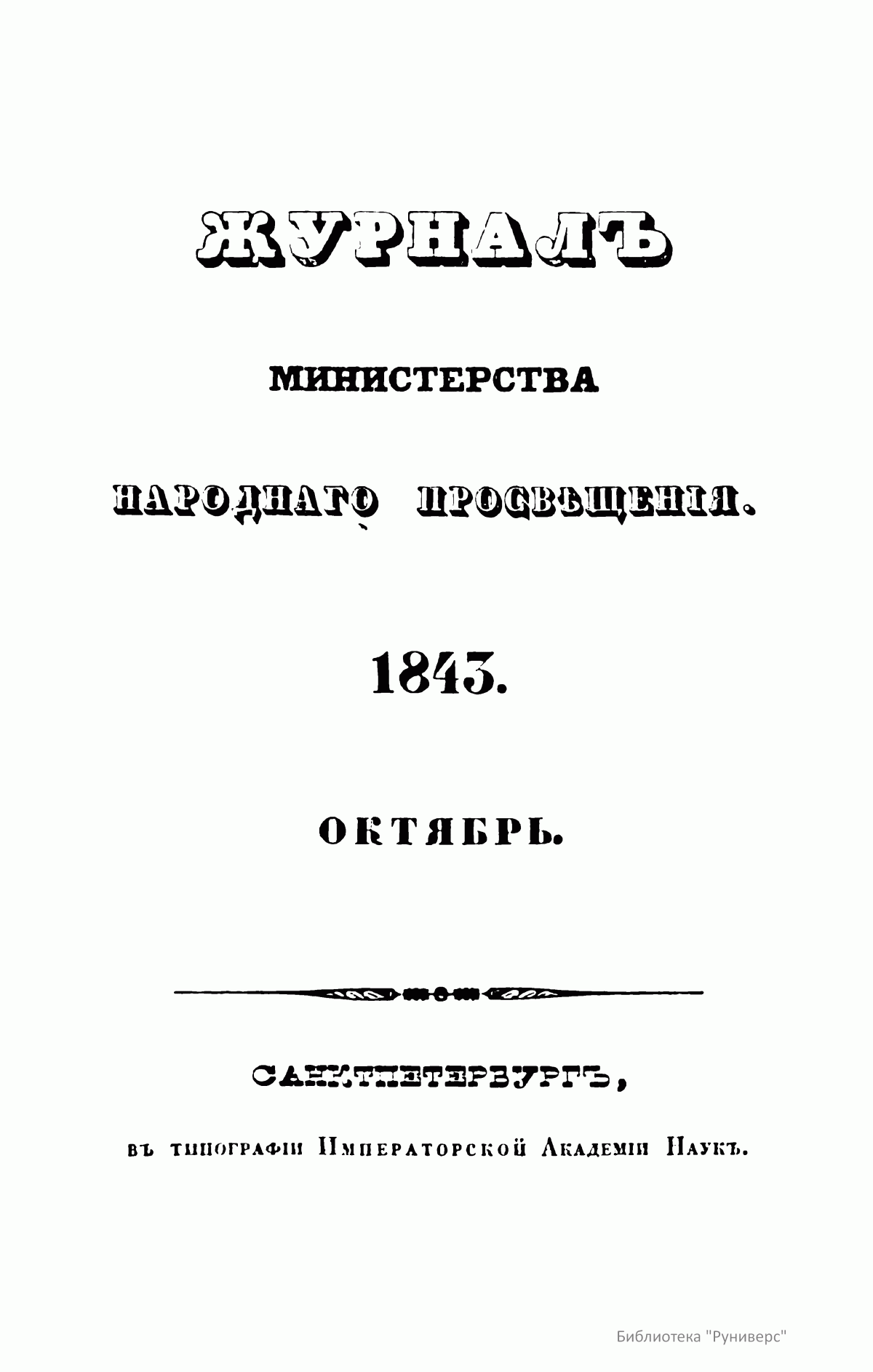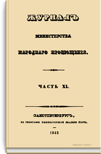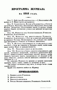 Журнал Министерства народного просвещения выходил с 1834-го по 1917 год. Официальный периодический журнал об успехах просвещения в России. Издатели журнала уверены в том, что «если для каждого человека необходим выход из грубой тьмы невежества и беспрерывное дальнейшее движение к свету, то для народов необходимо попечительное участие правительства в образовании. Только правительство имеет все средства знать и высоту успехов всемирного образования, и настоящие нужды Отечества».