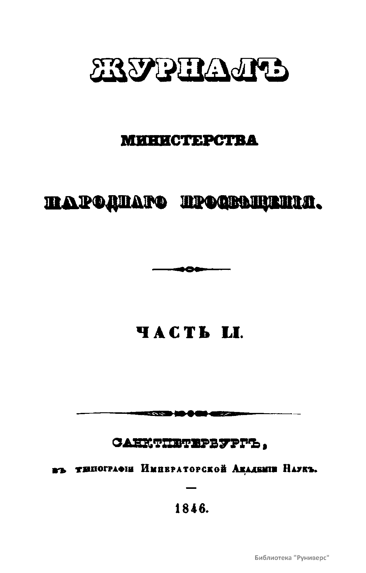 Журнал Министерства народного просвещения выходил с 1834-го по 1917 год. Официальный периодический журнал об успехах просвещения в России. Издатели журнала уверены в том, что «если для каждого человека необходим выход из грубой тьмы невежества и беспрерывное дальнейшее движение к свету, то для народов необходимо попечительное участие правительства в образовании. Только правительство имеет все средства знать и высоту успехов всемирного образования, и настоящие нужды Отечества».