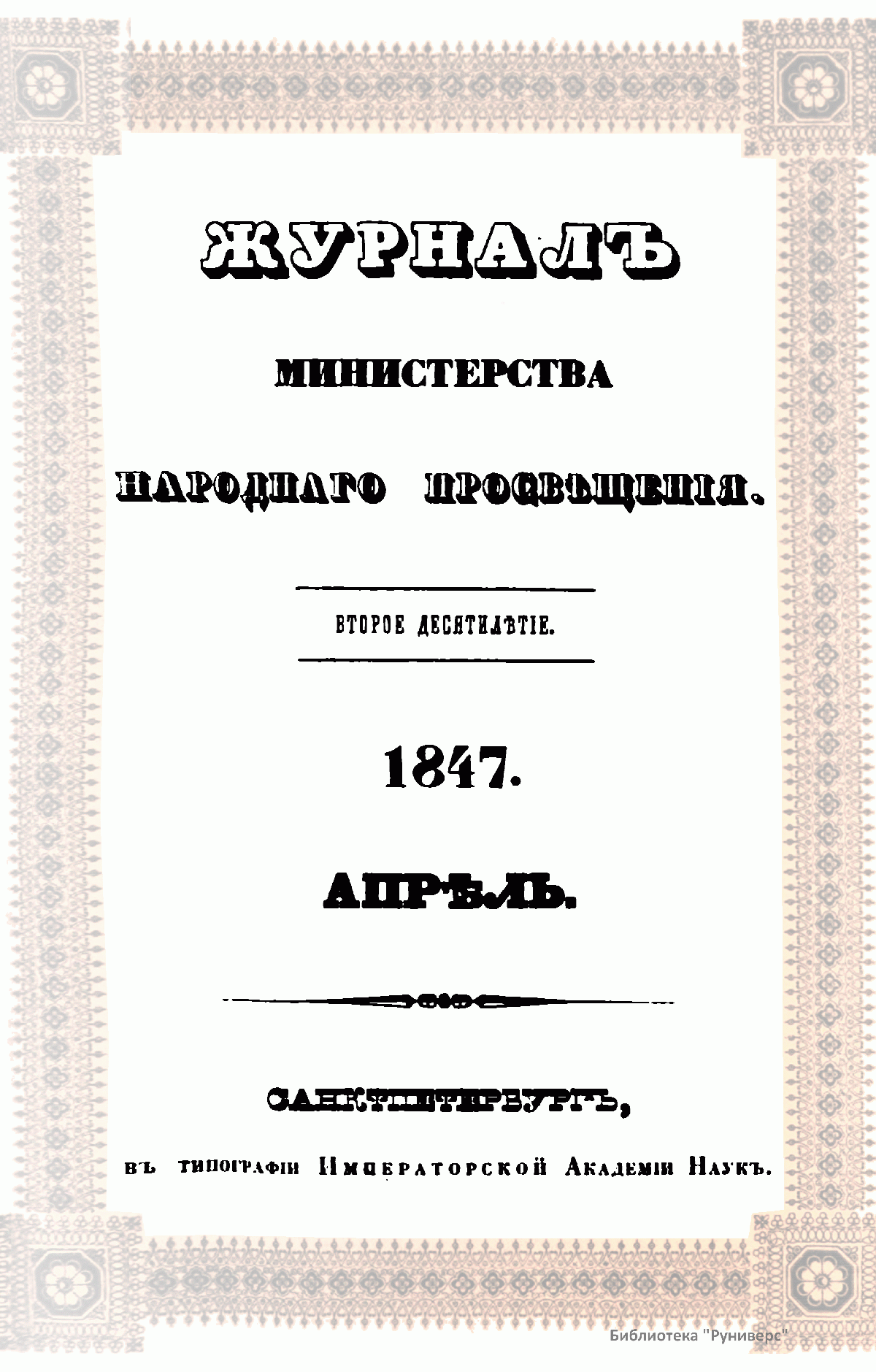 Журнал Министерства народного просвещения выходил с 1834-го по 1917 год. Официальный периодический журнал об успехах просвещения в России. Издатели журнала уверены в том, что «если для каждого человека необходим выход из грубой тьмы невежества и беспрерывное дальнейшее движение к свету, то для народов необходимо попечительное участие правительства в образовании. Только правительство имеет все средства знать и высоту успехов всемирного образования, и настоящие нужды Отечества».