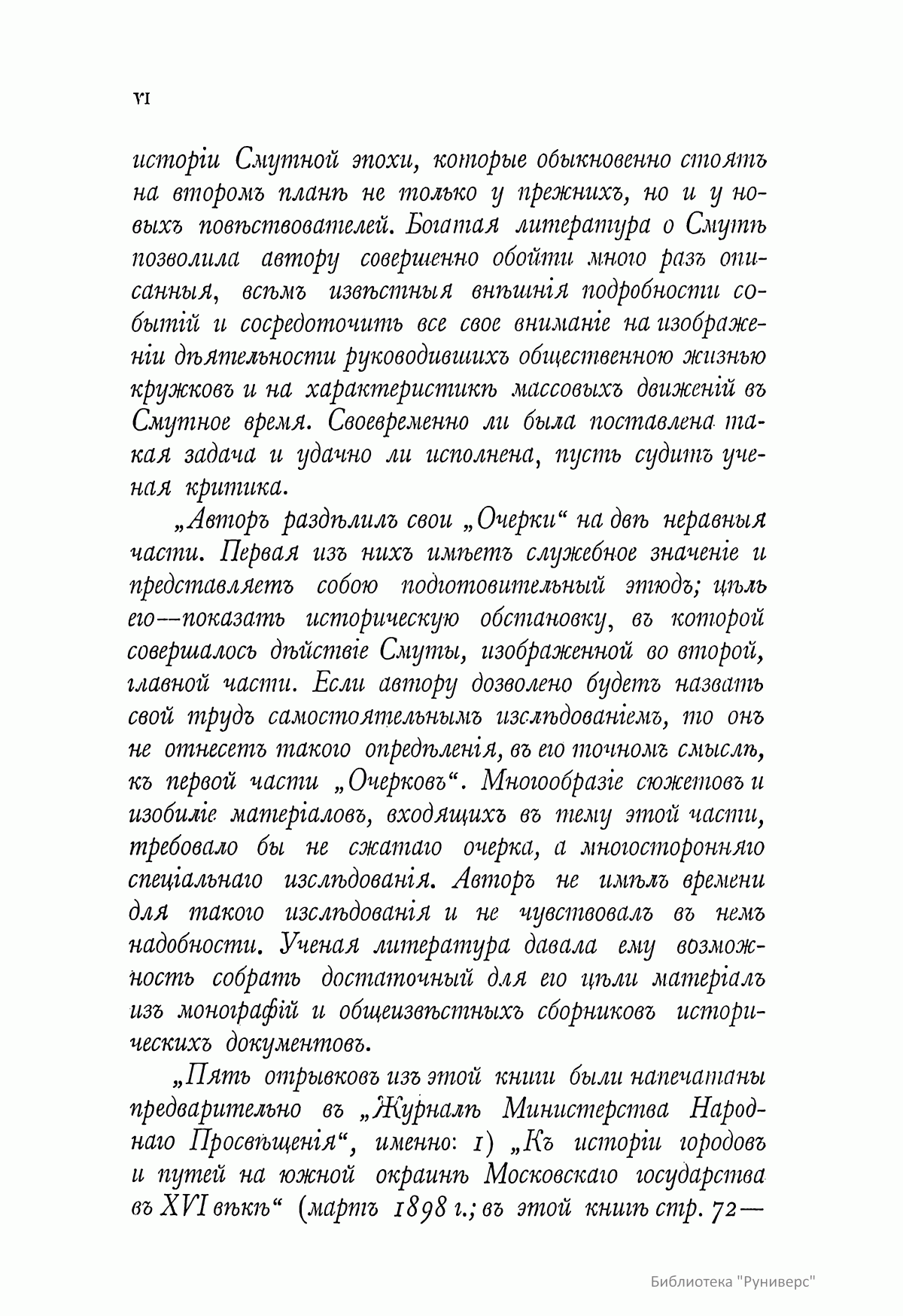 Настоящее издание представляет собой опыт изучения общественного строя и сословных отношений в Смутное время. Автор в своей работе рассматривает следующие положения. 1. Перед смутой Московское государство состояло из разнообразных в географическом и бытовом отношении областей, в которых уже не существовало почвы для сепаратизма. 2. Во второй половине XVI века Московское государство переживало сложный внутренний кризис, имевший особенную остроту для центральных и южных областей страны. 3. Этот кризис был политическим и представлял собой последствия вражды московской верховной власти с родовой княжеской аристократией. Выражением кризиса был насильственный переворот в сфере княжеского и вообще служилого землевладения, известный под именем опричнины. Он привел к полному ослаблению старой аристократии и к образованию в Москве нового слоя дворцовой знати. 4. Кризис был также и социальным и представлял собой последствия крупных перемен, произведенных в области поземельных отношений в интересах служилого класса. Выражением этой стороны кризиса был упадок и запустение земельных хозяйств служилого люда в центре государства и усиленный выход тяглых и крепостных людей на окраины и в «дикое поле». Эти обстоятельства вызывали недовольство населения в средних и южных областях государства. В земледельческой среде шла острая борьба за рабочие руки с общей тенденцией к закрепощению трудовой массы. В этой же последней вырастало оппозиционное отношение к московскому общественному порядку и желание общественных перемен. 5. Таким образом, под действием кризиса московское общество разделилось на враждебные друг другу слои и приближалось к открытому междоусобию настолько явно, что еще до прекращения старой московской династии иноземные и местные наблюдатели событий имели возможность предсказывать неизбежность внутренней Смуты в Московском государстве. 6. В развитии Смуты различаются три периода: династической борьбы, социальной борьбы и борьбы национальной. В первом происходит борьба за московский престол между различными на него претендентами. Во втором совершается разложение государственного порядка и падение политической самостоятельности Москвы вследствие социального междоусобия, вызванного борьбой за престол. В третьем наблюдается ряд попыток со стороны московских людей к восстановлению государственной самостоятельности и общественного порядка, разрушенного Смутой и иноземным завоеванием. 7. В развитии начального периода Смуты можно различить два момента. Первый представляет борьбу небольшого кружка дворцовой знати за власть и престол. Эта борьба имеет характер придворной интриги и заканчивается воцарением Б. Ф. Годунова. Во втором моменте Смута переносится из дворца в воинские массы, которым и передается решающая роль в борьбе за престол различных претендентов на власть. Победителем в этой борьбе стал князь В. И. Шуйский, который соединил вокруг себя остатки княжеской московской аристократии, уцелевшие от опричнины Грозного и Годуновского режима. Установлением реакционного правительства «княжат» завершается первый период Смуты. 8. Второй период Смуты имеет характер открытого социального междоусобия. Воинские массы, вовлеченные в династическую борьбу в качестве силы, решающей дело, поняли свое значение