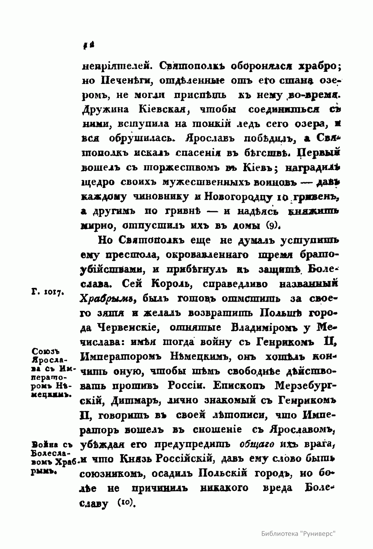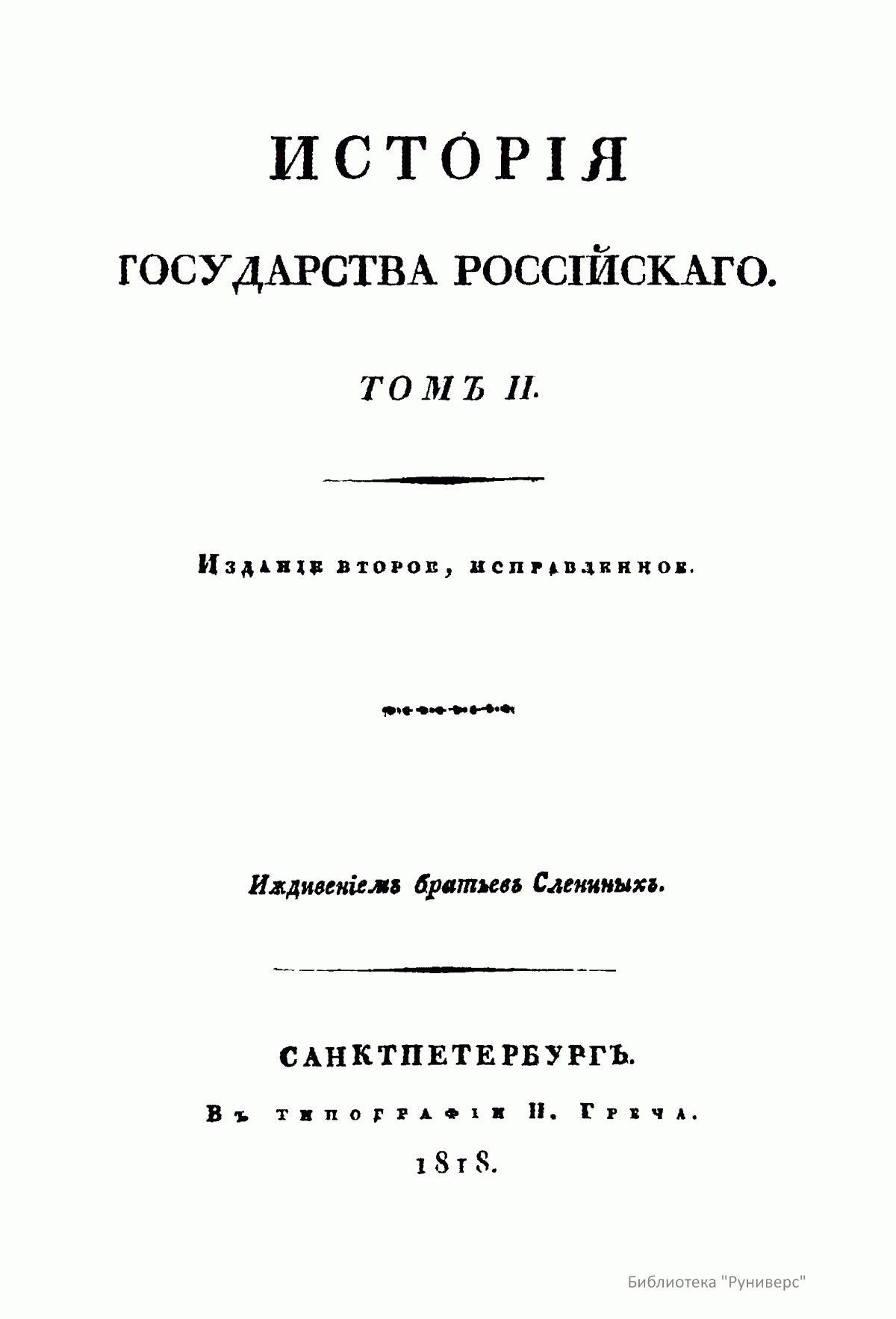 В 1816 году он выпустил первые восемь томов «Истории государства Российского», трёхтысячный тираж которых разошелся в течение месяца. В последующие годы вышли еще три тома «Истории», появился ряд переводов её на главнейшие европейские языки. Тенденциозно-монархическое освещение русского исторического процесса сблизило Карамзина с двором и царем, поселившим его подле себя в Царском Селе. Незаконченный XII том был издан уже после его смерти.