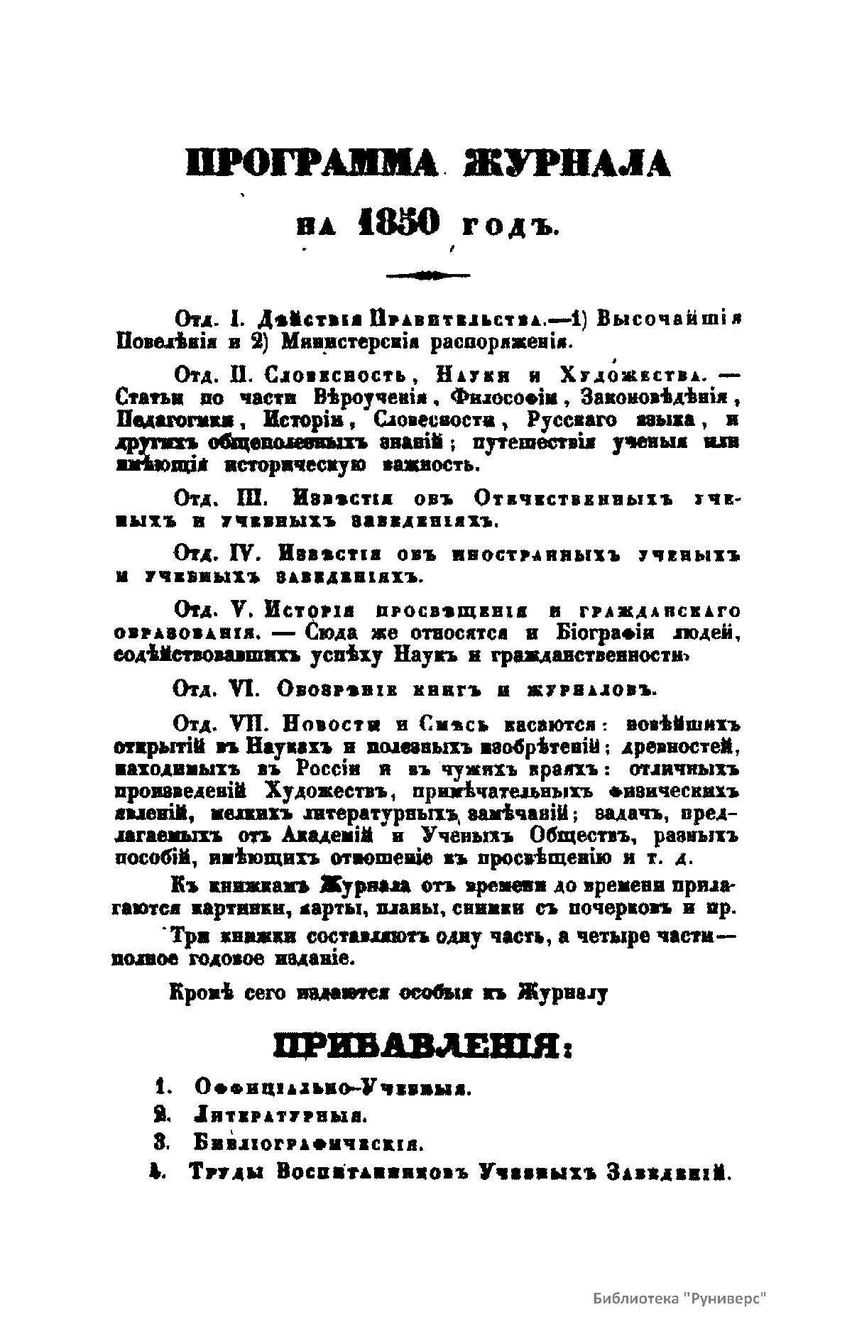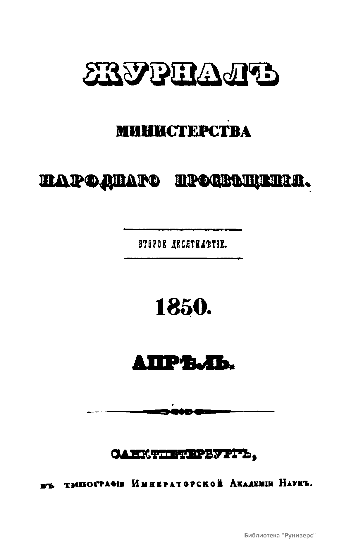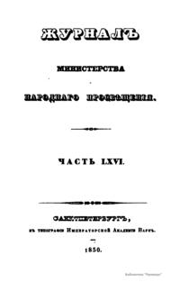Журнал Министерства народного просвещения выходил с 1834-го по 1917 год. Официальный периодический журнал об успехах просвещения в России. Издатели журнала уверены в том, что «если для каждого человека необходим выход из грубой тьмы невежества и беспрерывное дальнейшее движение к свету, то для народов необходимо попечительное участие правительства в образовании. Только правительство имеет все средства знать и высоту успехов всемирного образования, и настоящие нужды Отечества».