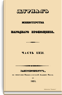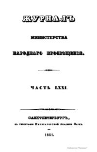 Журнал Министерства народного просвещения выходил с 1834-го по 1917 год. Официальный периодический журнал об успехах просвещения в России. Издатели журнала уверены в том, что «если для каждого человека необходим выход из грубой тьмы невежества и беспрерывное дальнейшее движение к свету, то для народов необходимо попечительное участие правительства в образовании. Только правительство имеет все средства знать и высоту успехов всемирного образования, и настоящие нужды Отечества».