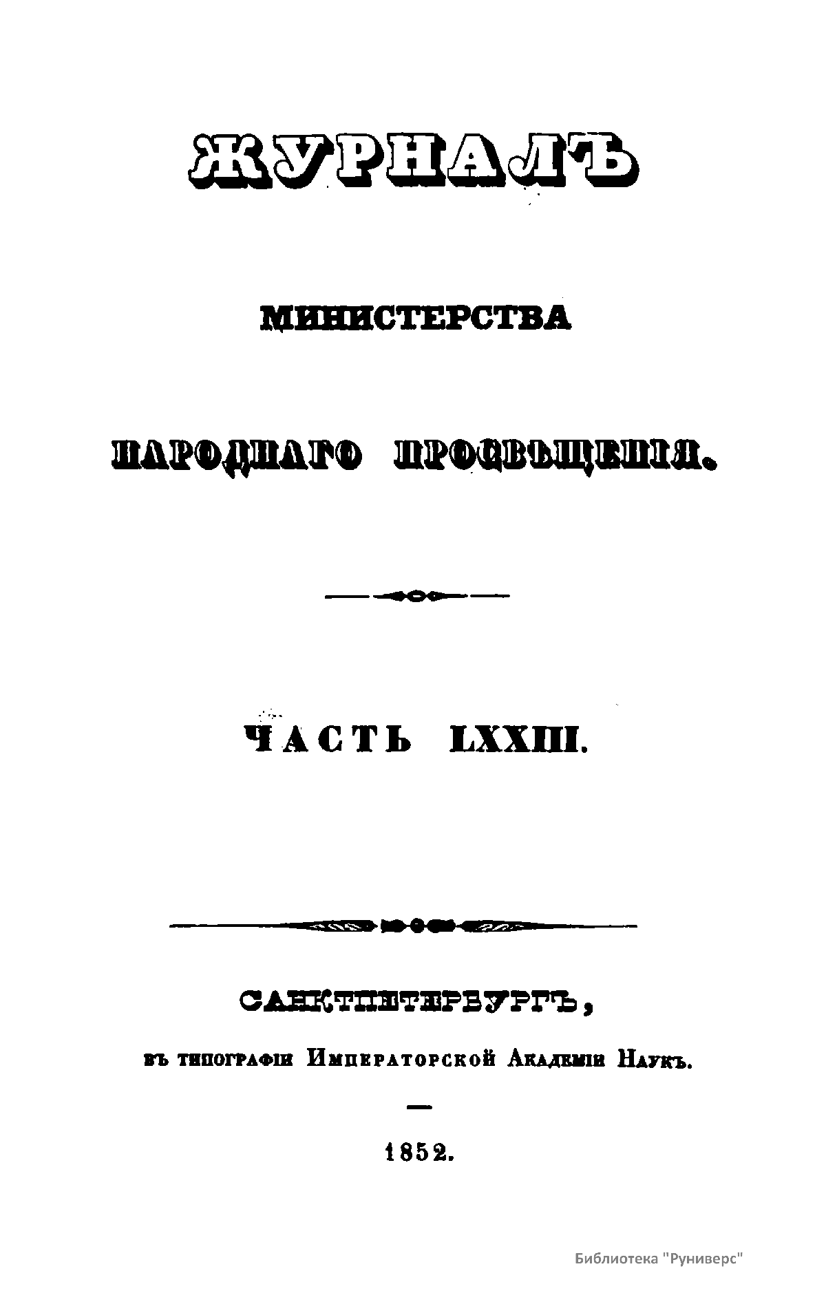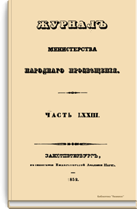 Журнал Министерства народного просвещения выходил с 1834-го по 1917 год. Официальный периодический журнал об успехах просвещения в России. Издатели журнала уверены в том, что «если для каждого человека необходим выход из грубой тьмы невежества и беспрерывное дальнейшее движение к свету, то для народов необходимо попечительное участие правительства в образовании. Только правительство имеет все средства знать и высоту успехов всемирного образования, и настоящие нужды Отечества».