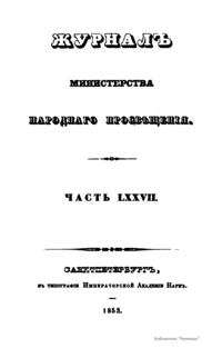 Журнал Министерства народного просвещения выходил с 1834-го по 1917 год. Официальный периодический журнал об успехах просвещения в России. Издатели журнала уверены в том, что «если для каждого человека необходим выход из грубой тьмы невежества и беспрерывное дальнейшее движение к свету, то для народов необходимо попечительное участие правительства в образовании. Только правительство имеет все средства знать и высоту успехов всемирного образования, и настоящие нужды Отечества».