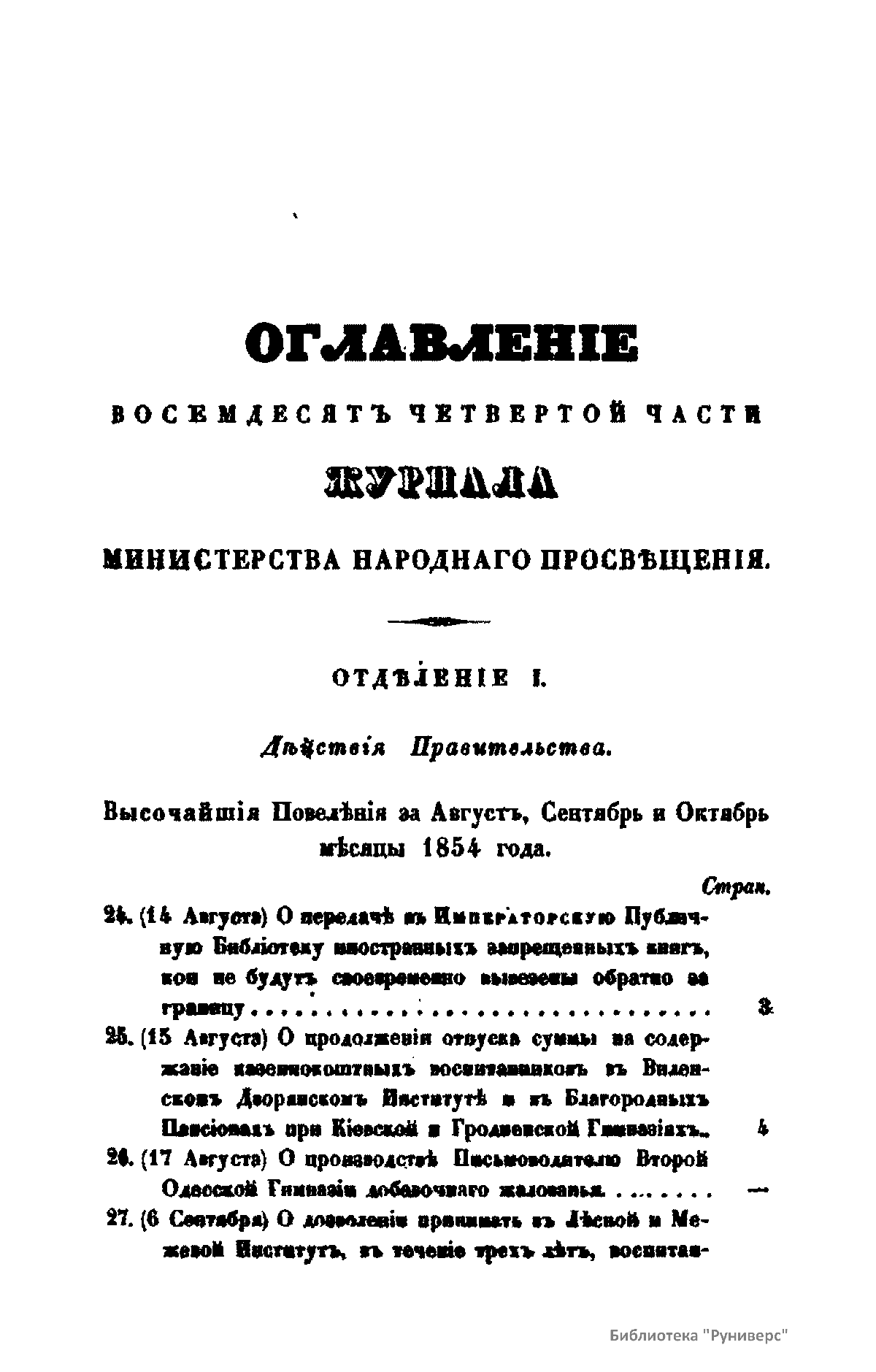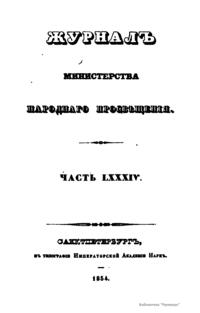 Журнал Министерства народного просвещения выходил с 1834-го по 1917 год. Официальный периодический журнал об успехах просвещения в России. Издатели журнала уверены в том, что «если для каждого человека необходим выход из грубой тьмы невежества и беспрерывное дальнейшее движение к свету, то для народов необходимо попечительное участие правительства в образовании. Только правительство имеет все средства знать и высоту успехов всемирного образования, и настоящие нужды Отечества».