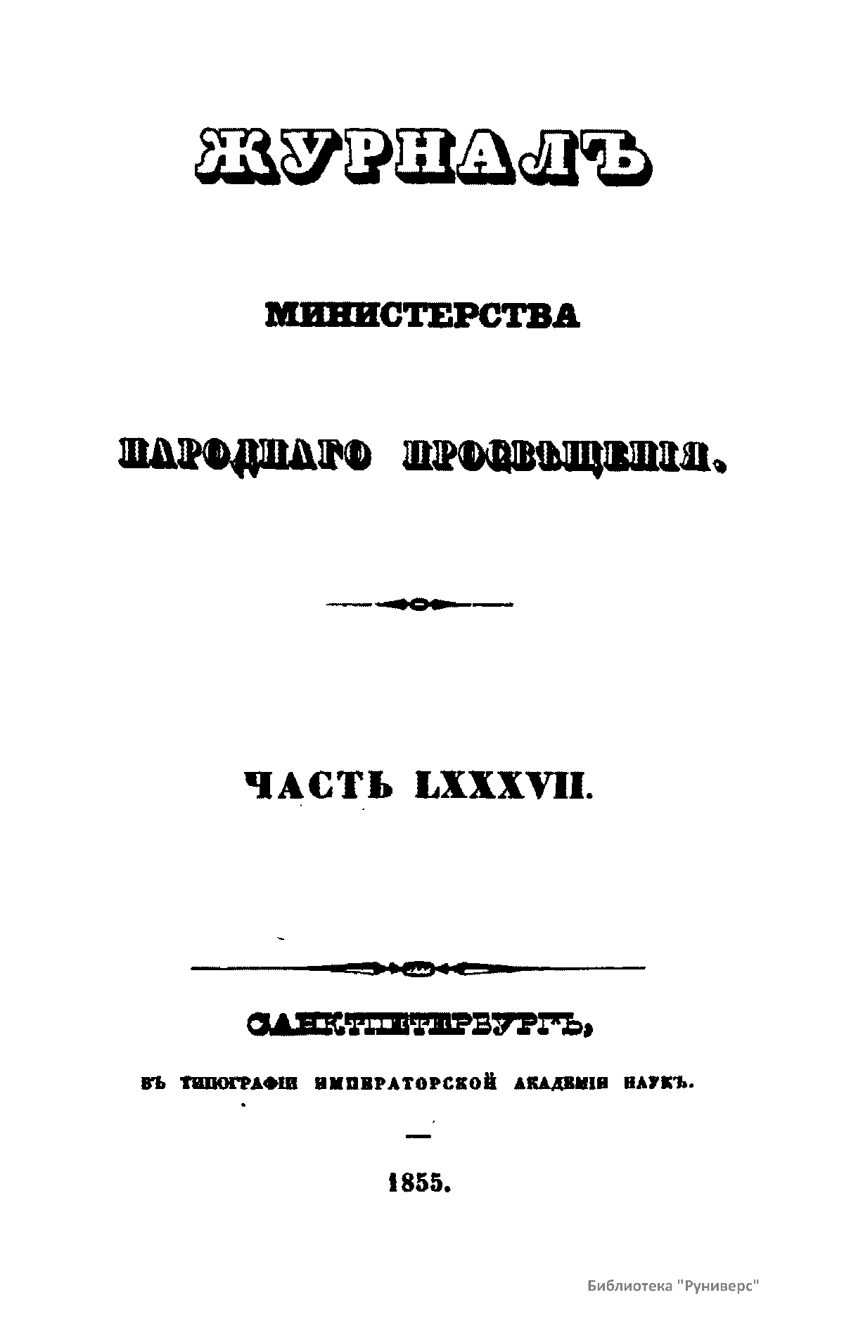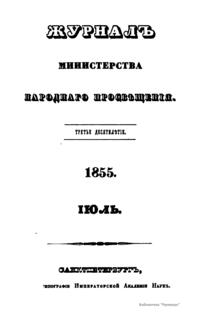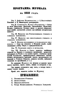 Журнал Министерства народного просвещения выходил с 1834-го по 1917 год. Официальный периодический журнал об успехах просвещения в России. Издатели журнала уверены в том, что «если для каждого человека необходим выход из грубой тьмы невежества и беспрерывное дальнейшее движение к свету, то для народов необходимо попечительное участие правительства в образовании. Только правительство имеет все средства знать и высоту успехов всемирного образования, и настоящие нужды Отечества».