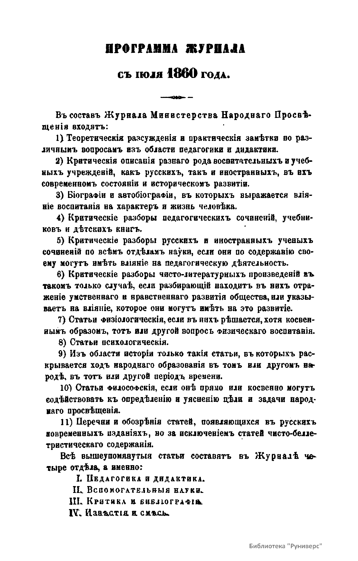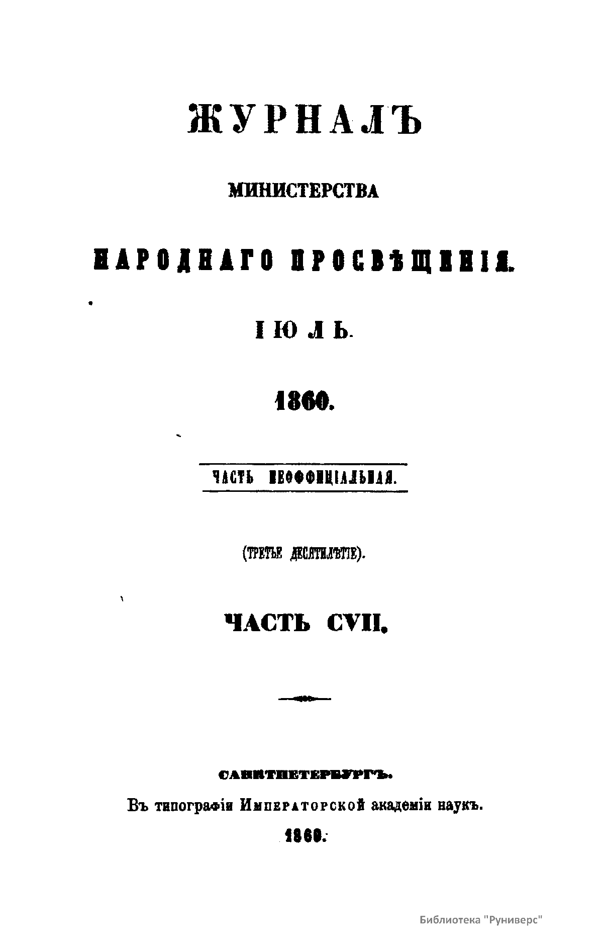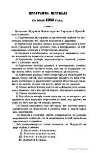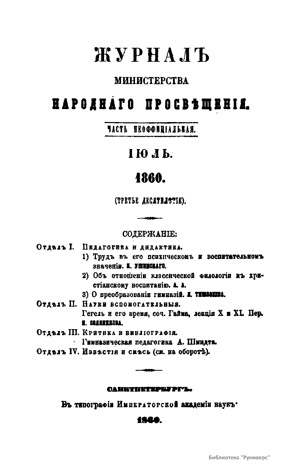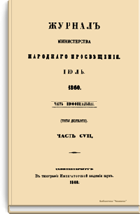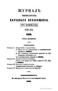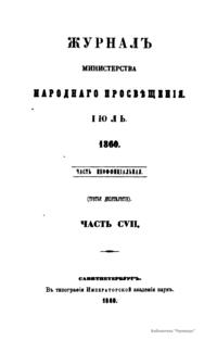 Журнал Министерства народного просвещения выходил с 1834-го по 1917 год. Официальный периодический журнал об успехах просвещения в России. Издатели журнала уверены в том, что «если для каждого человека необходим выход из грубой тьмы невежества и беспрерывное дальнейшее движение к свету, то для народов необходимо попечительное участие правительства в образовании. Только правительство имеет все средства знать и высоту успехов всемирного образования, и настоящие нужды Отечества».