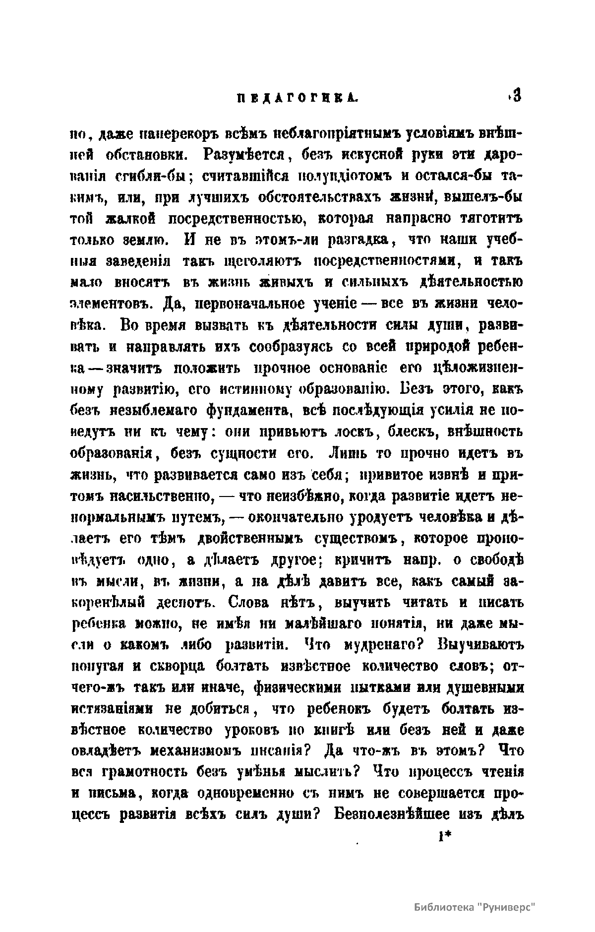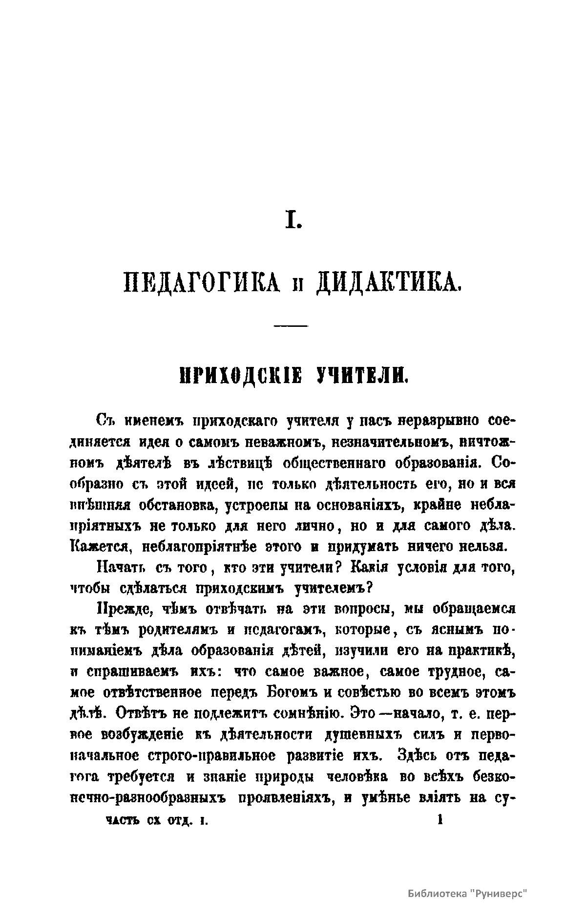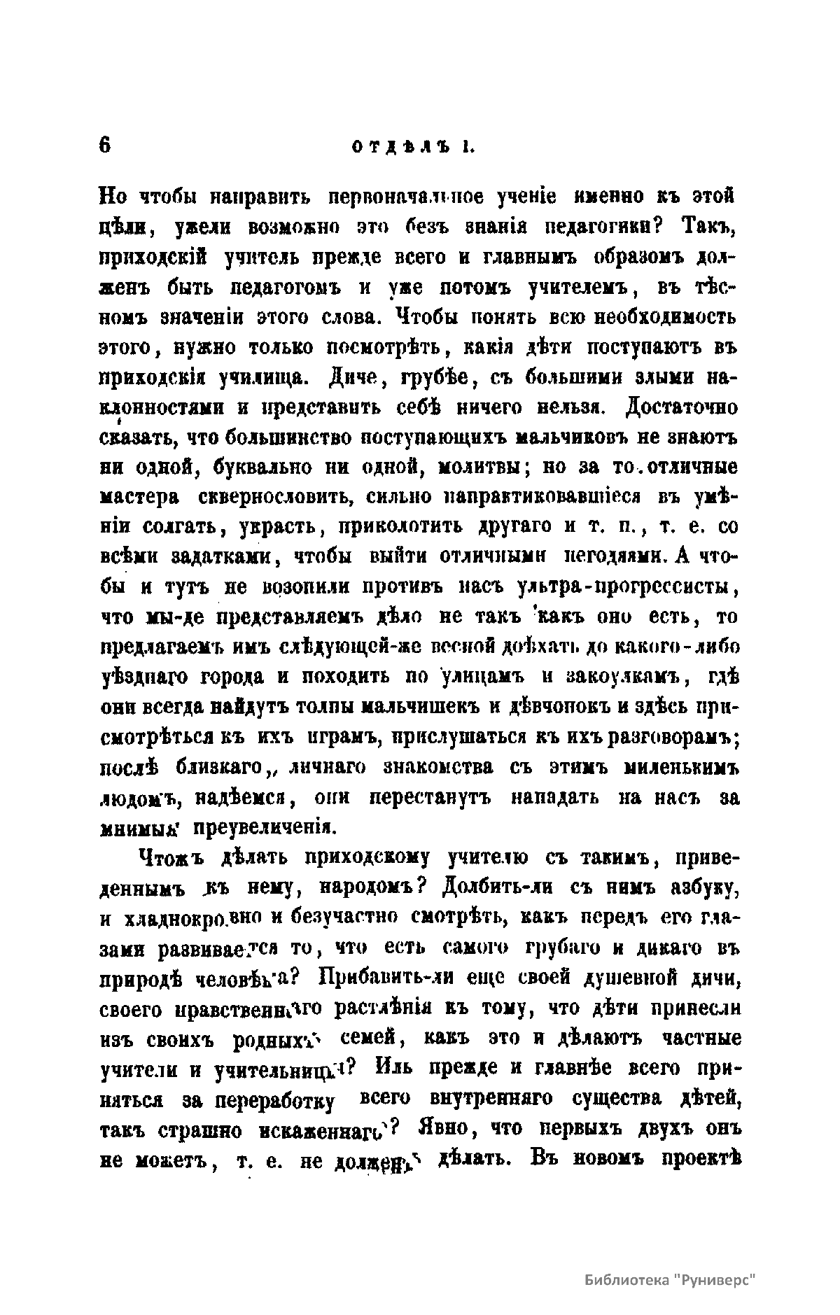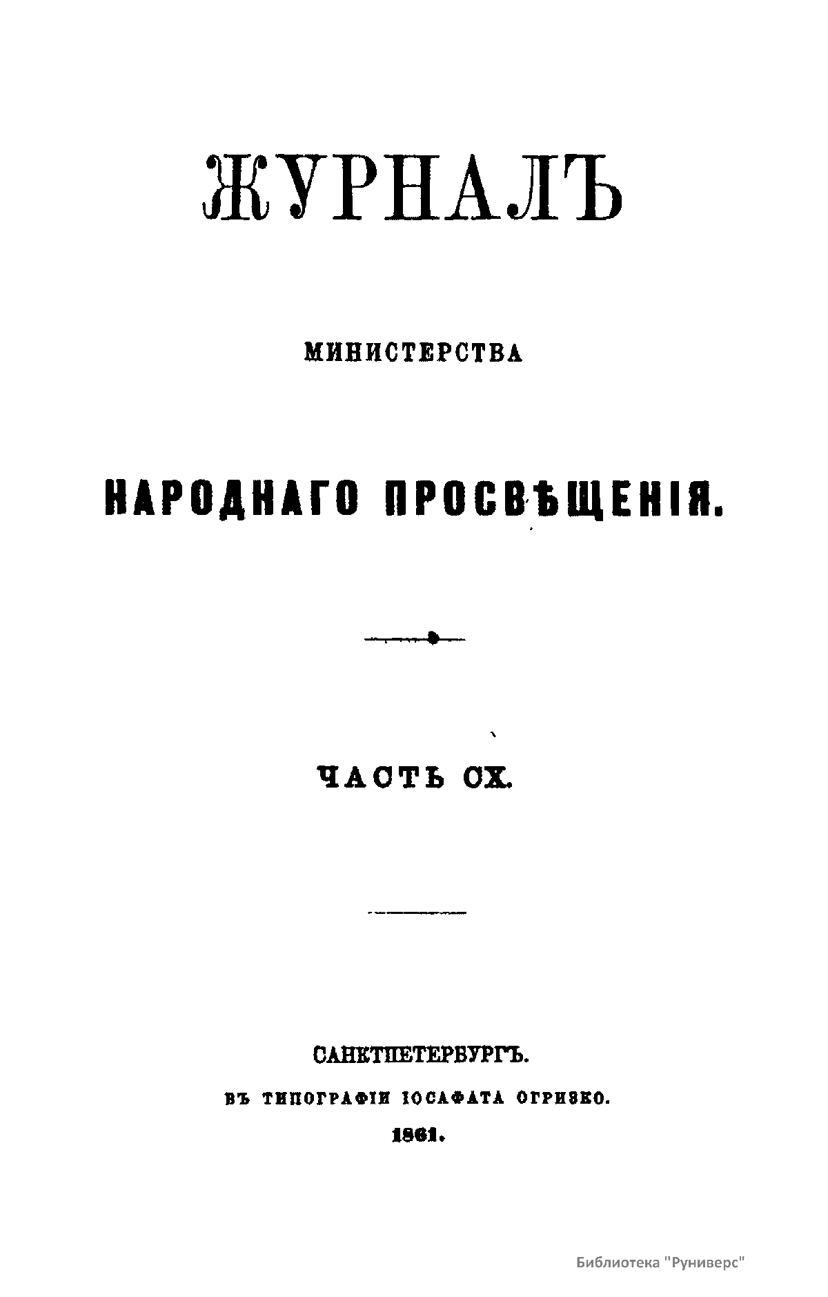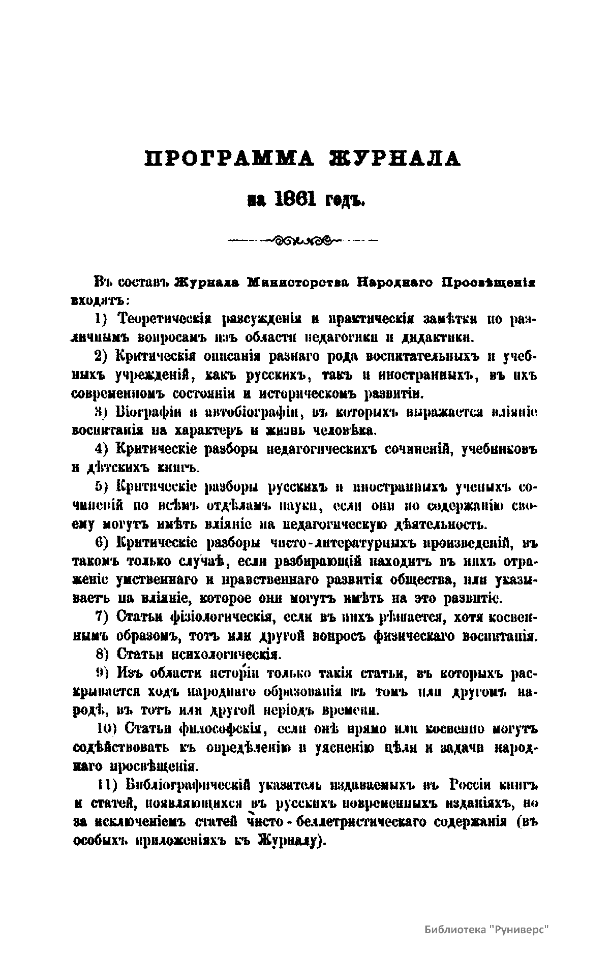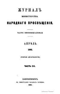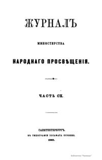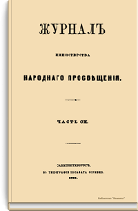 Журнал Министерства народного просвещения выходил с 1834-го по 1917 год. Официальный периодический журнал об успехах просвещения в России. Издатели журнала уверены в том, что «если для каждого человека необходим выход из грубой тьмы невежества и беспрерывное дальнейшее движение к свету, то для народов необходимо попечительное участие правительства в образовании. Только правительство имеет все средства знать и высоту успехов всемирного образования, и настоящие нужды Отечества».