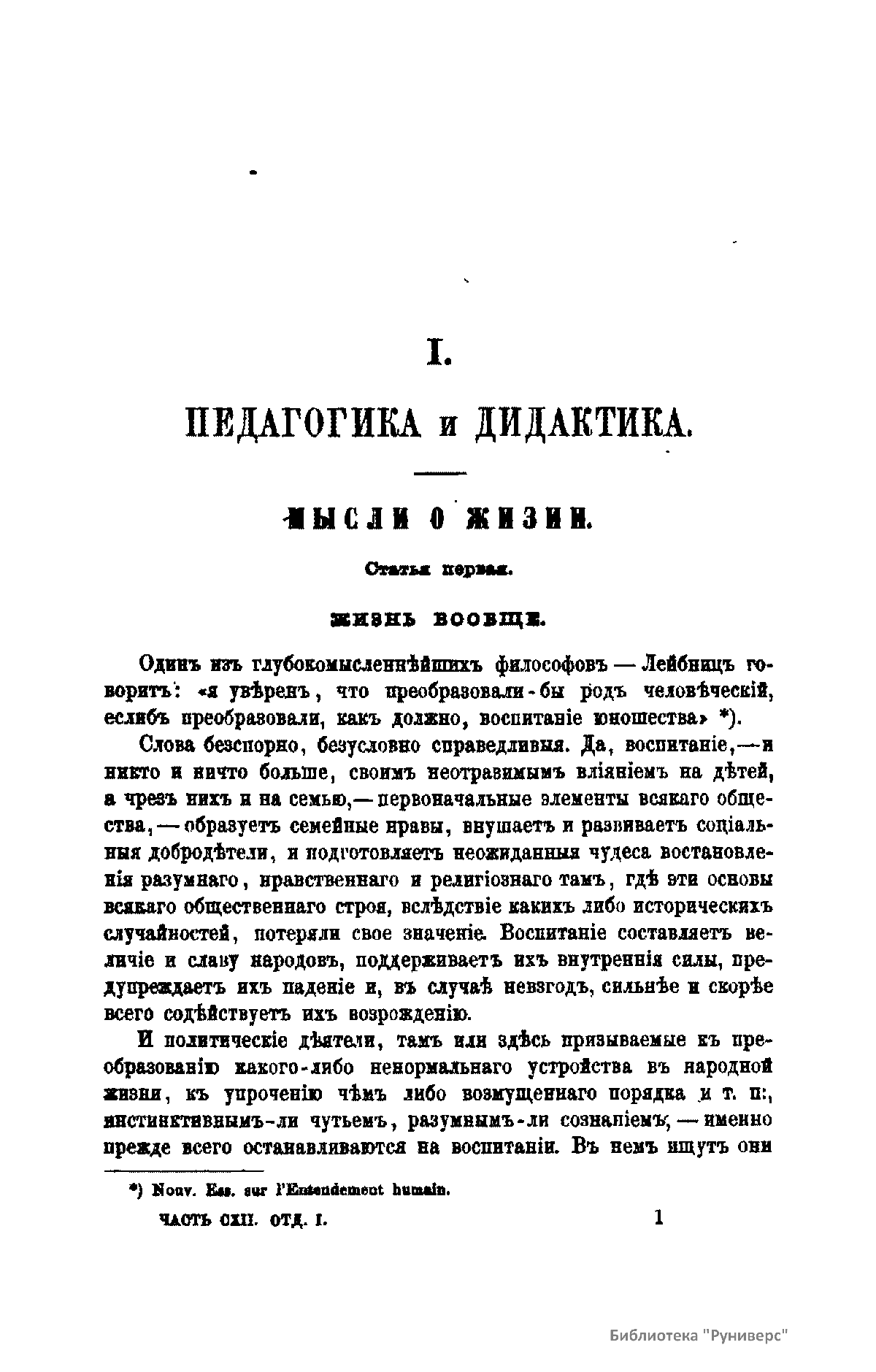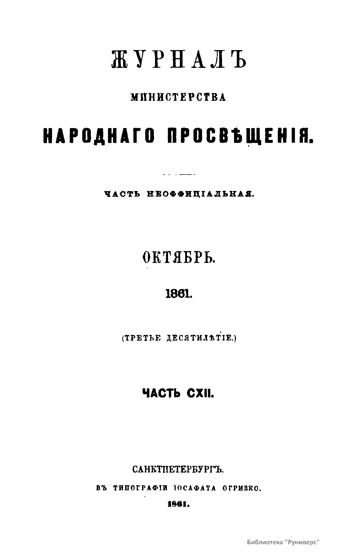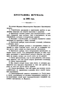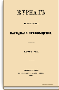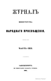 Журнал Министерства народного просвещения выходил с 1834-го по 1917 год. Официальный периодический журнал об успехах просвещения в России. Издатели журнала уверены в том, что «если для каждого человека необходим выход из грубой тьмы невежества и беспрерывное дальнейшее движение к свету, то для народов необходимо попечительное участие правительства в образовании. Только правительство имеет все средства знать и высоту успехов всемирного образования, и настоящие нужды Отечества».
