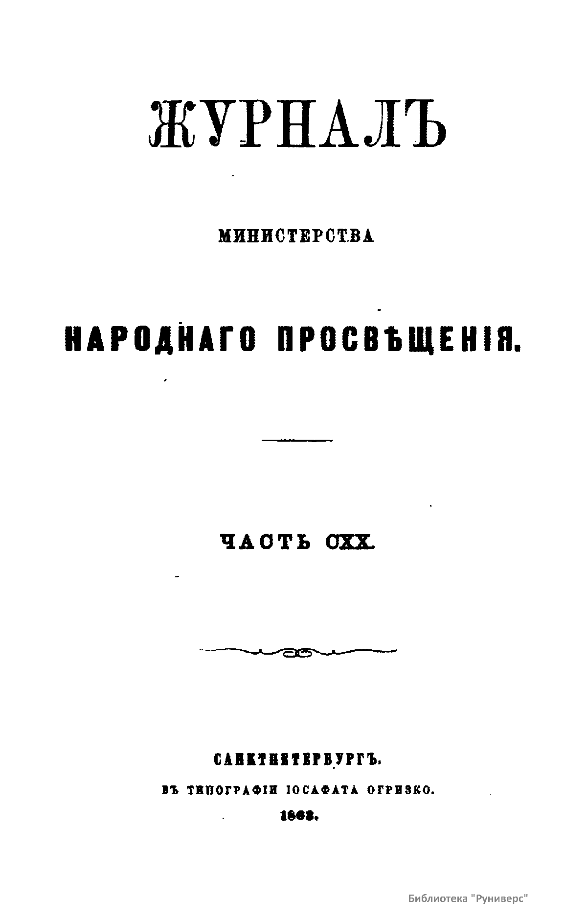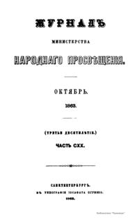 Журнал Министерства народного просвещения выходил с 1834-го по 1917 год. Официальный периодический журнал об успехах просвещения в России. Издатели журнала уверены в том, что «если для каждого человека необходим выход из грубой тьмы невежества и беспрерывное дальнейшее движение к свету, то для народов необходимо попечительное участие правительства в образовании. Только правительство имеет все средства знать и высоту успехов всемирного образования, и настоящие нужды Отечества».