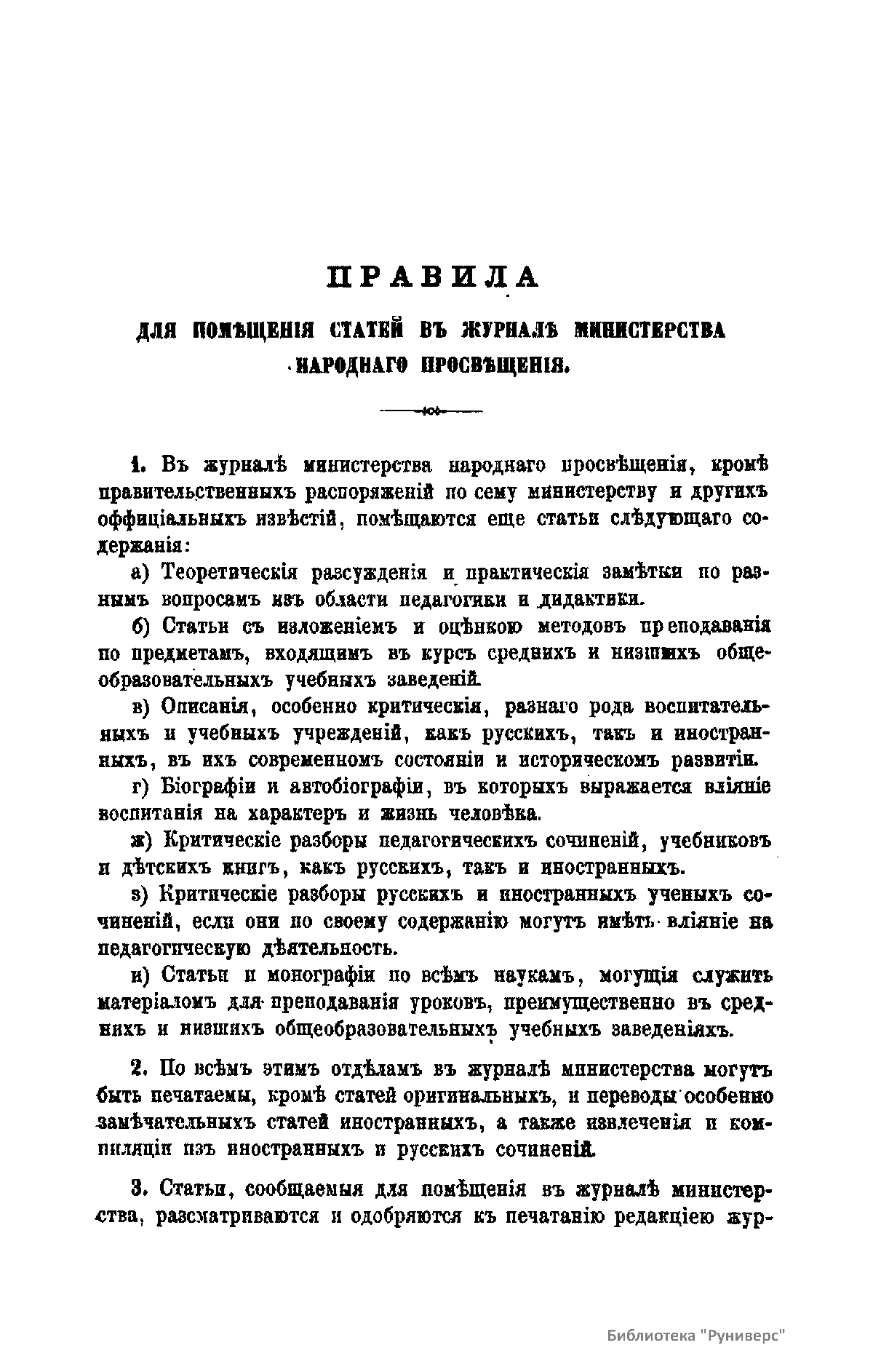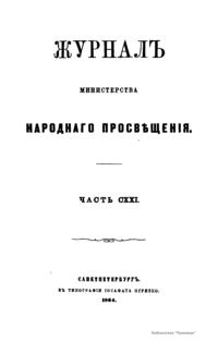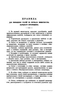 Журнал Министерства народного просвещения выходил с 1834-го по 1917 год. Официальный периодический журнал об успехах просвещения в России. Издатели журнала уверены в том, что «если для каждого человека необходим выход из грубой тьмы невежества и беспрерывное дальнейшее движение к свету, то для народов необходимо попечительное участие правительства в образовании. Только правительство имеет все средства знать и высоту успехов всемирного образования, и настоящие нужды Отечества».