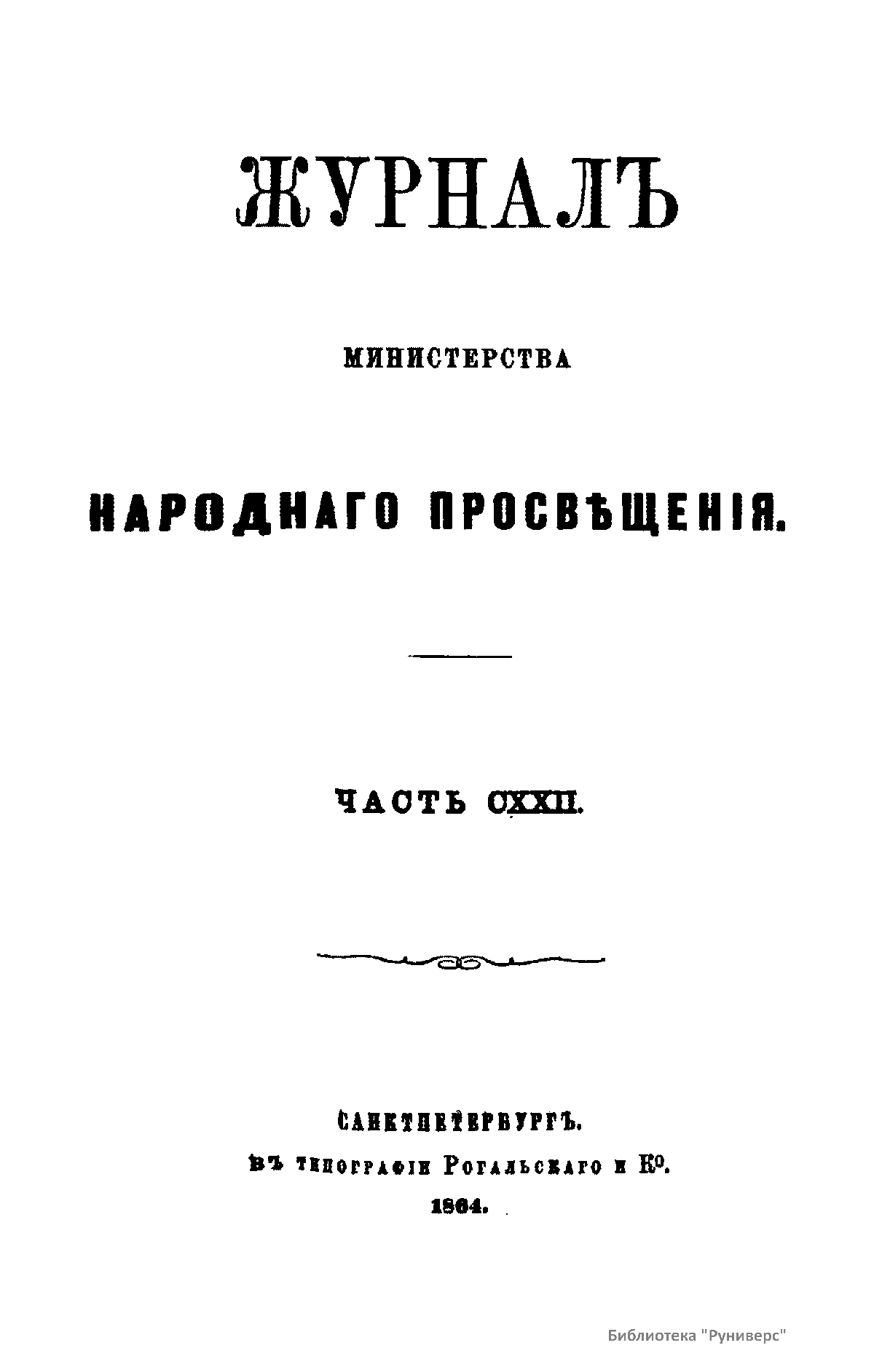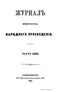 Журнал Министерства народного просвещения выходил с 1834-го по 1917 год. Официальный периодический журнал об успехах просвещения в России. Издатели журнала уверены в том, что «если для каждого человека необходим выход из грубой тьмы невежества и беспрерывное дальнейшее движение к свету, то для народов необходимо попечительное участие правительства в образовании. Только правительство имеет все средства знать и высоту успехов всемирного образования, и настоящие нужды Отечества».