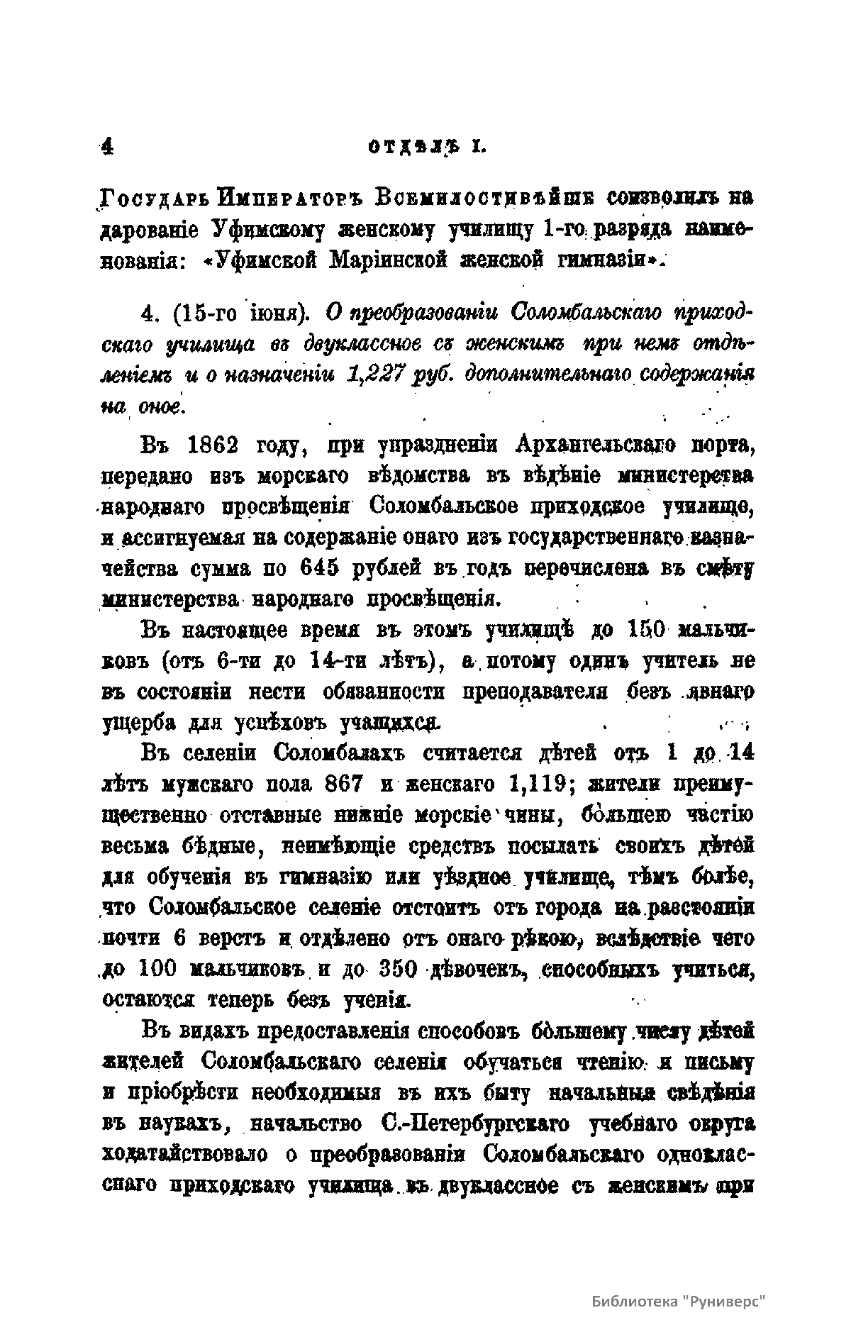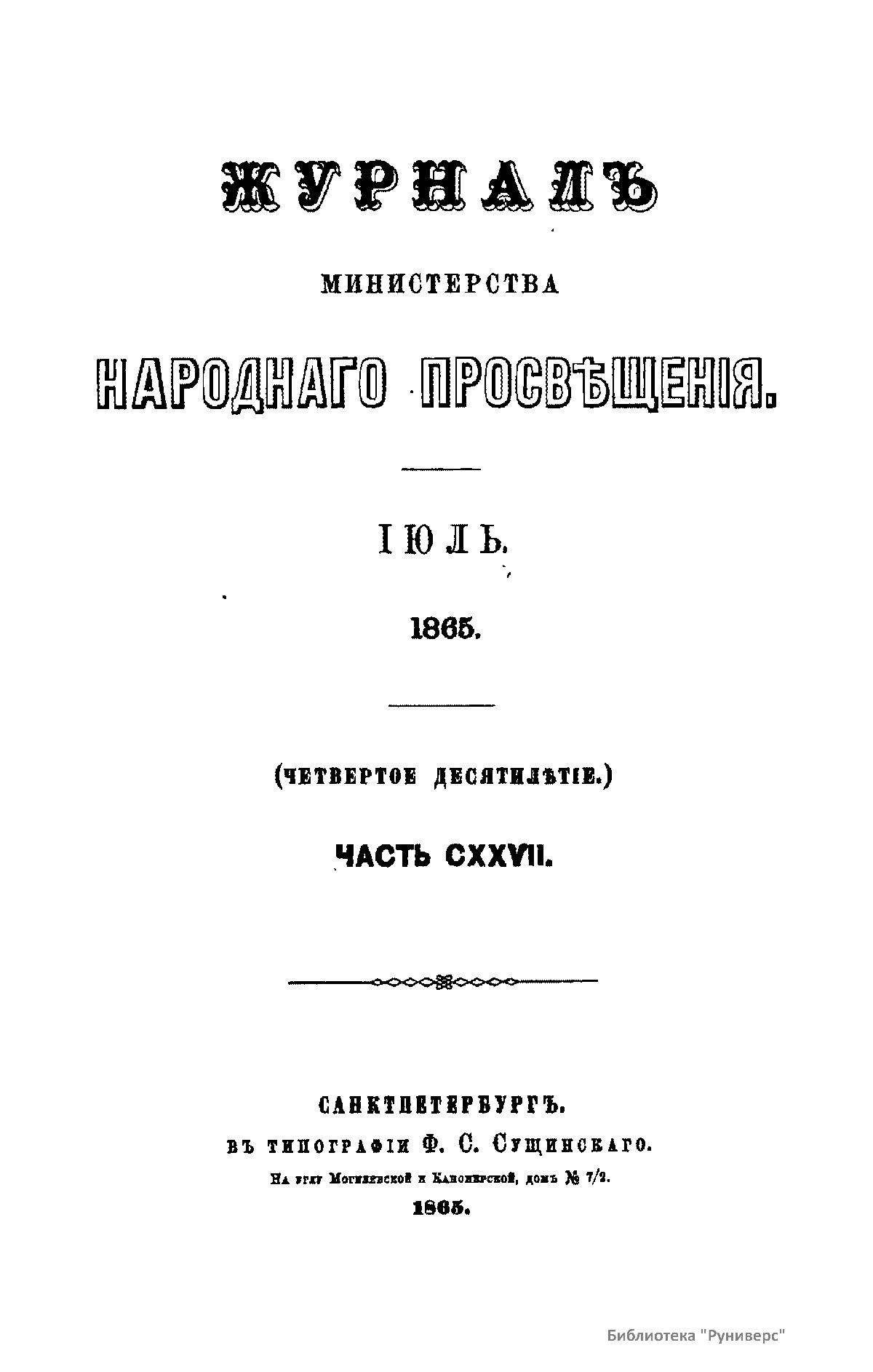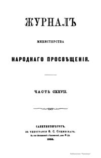 Журнал Министерства народного просвещения выходил с 1834-го по 1917 год. Официальный периодический журнал об успехах просвещения в России. Издатели журнала уверены в том, что «если для каждого человека необходим выход из грубой тьмы невежества и беспрерывное дальнейшее движение к свету, то для народов необходимо попечительное участие правительства в образовании. Только правительство имеет все средства знать и высоту успехов всемирного образования, и настоящие нужды Отечества».