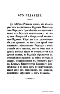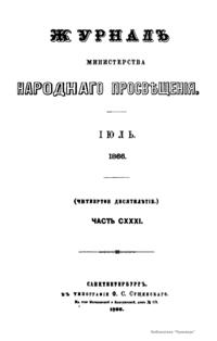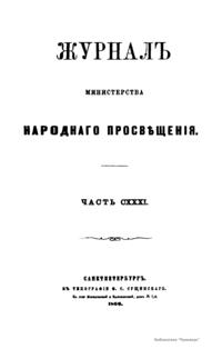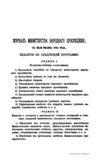 Журнал Министерства народного просвещения выходил с 1834-го по 1917 год. Официальный периодический журнал об успехах просвещения в России. Издатели журнала уверены в том, что «если для каждого человека необходим выход из грубой тьмы невежества и беспрерывное дальнейшее движение к свету, то для народов необходимо попечительное участие правительства в образовании. Только правительство имеет все средства знать и высоту успехов всемирного образования, и настоящие нужды Отечества».