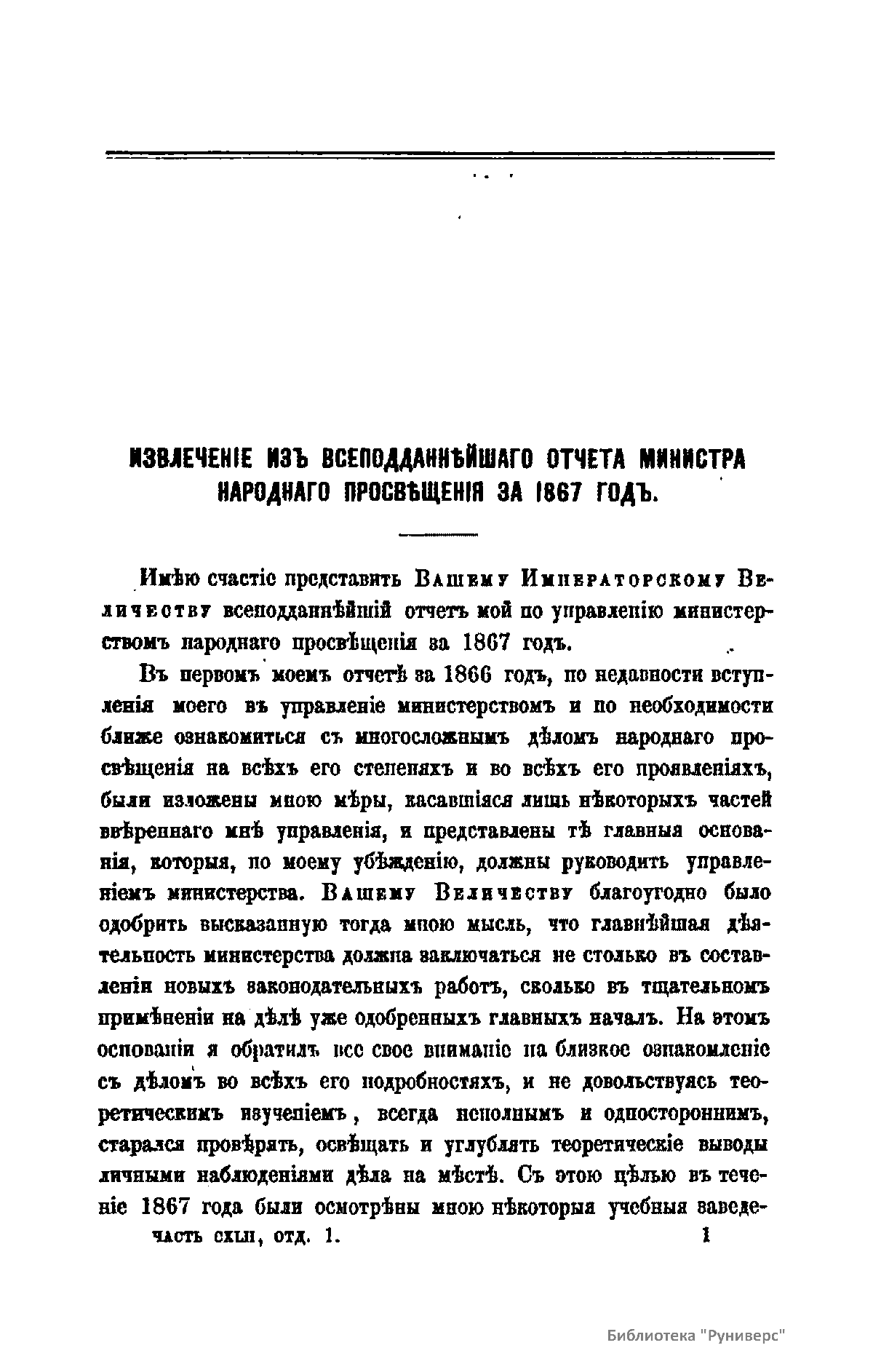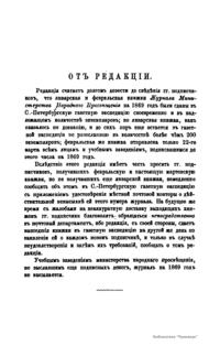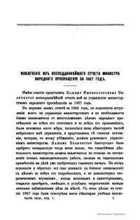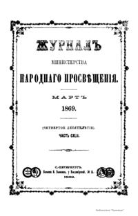 Журнал Министерства народного просвещения выходил с 1834-го по 1917 год. Официальный периодический журнал об успехах просвещения в России. Издатели журнала уверены в том, что «если для каждого человека необходим выход из грубой тьмы невежества и беспрерывное дальнейшее движение к свету, то для народов необходимо попечительное участие правительства в образовании. Только правительство имеет все средства знать и высоту успехов всемирного образования, и настоящие нужды Отечества».