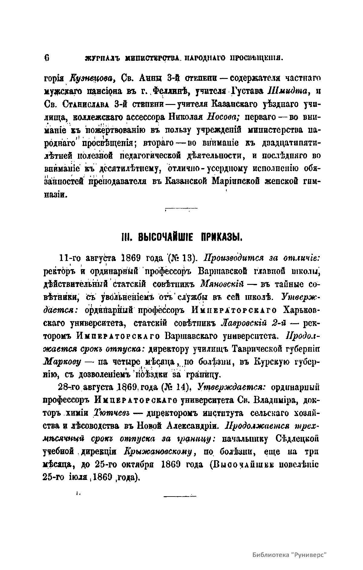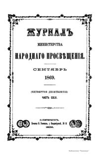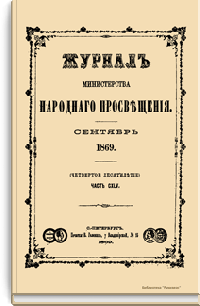 Журнал Министерства народного просвещения выходил с 1834-го по 1917 год. Официальный периодический журнал об успехах просвещения в России. Издатели журнала уверены в том, что «если для каждого человека необходим выход из грубой тьмы невежества и беспрерывное дальнейшее движение к свету, то для народов необходимо попечительное участие правительства в образовании. Только правительство имеет все средства знать и высоту успехов всемирного образования, и настоящие нужды Отечества».