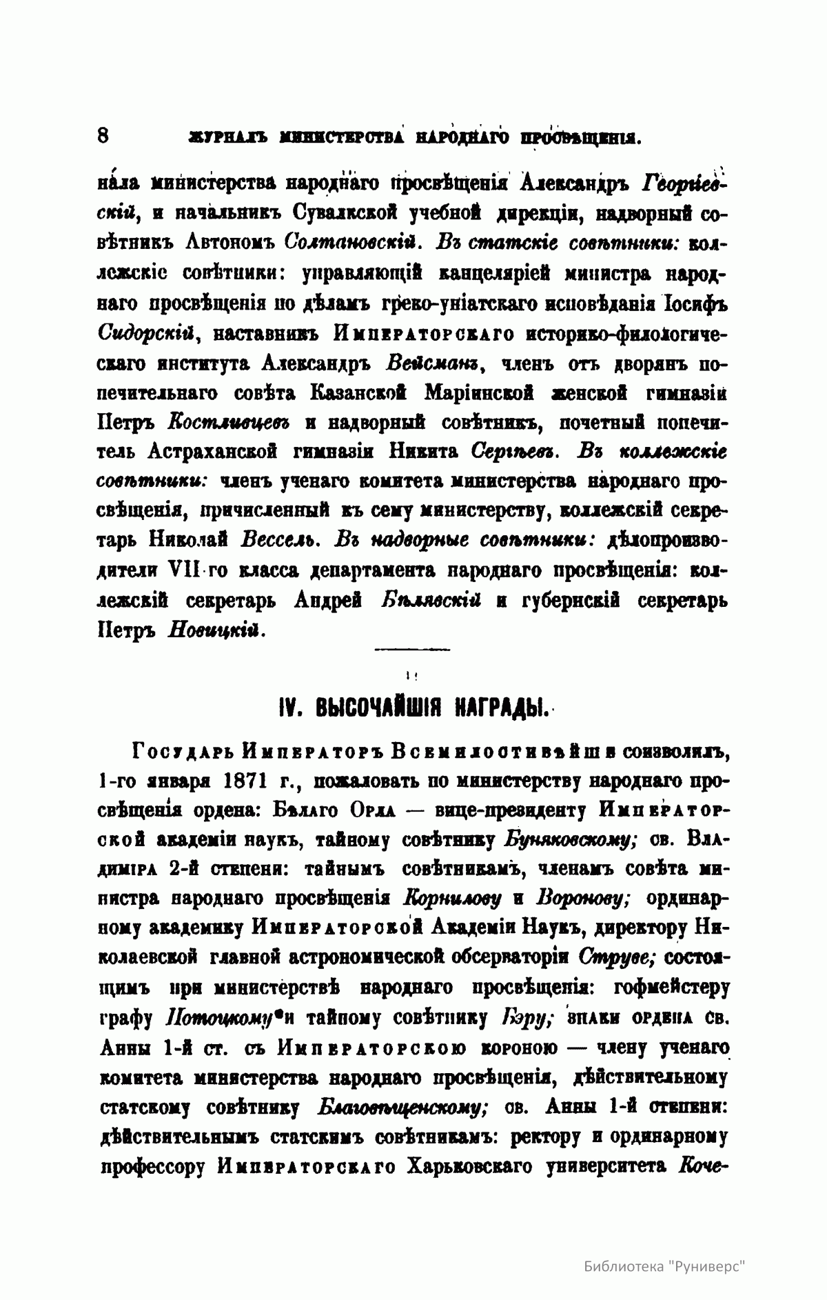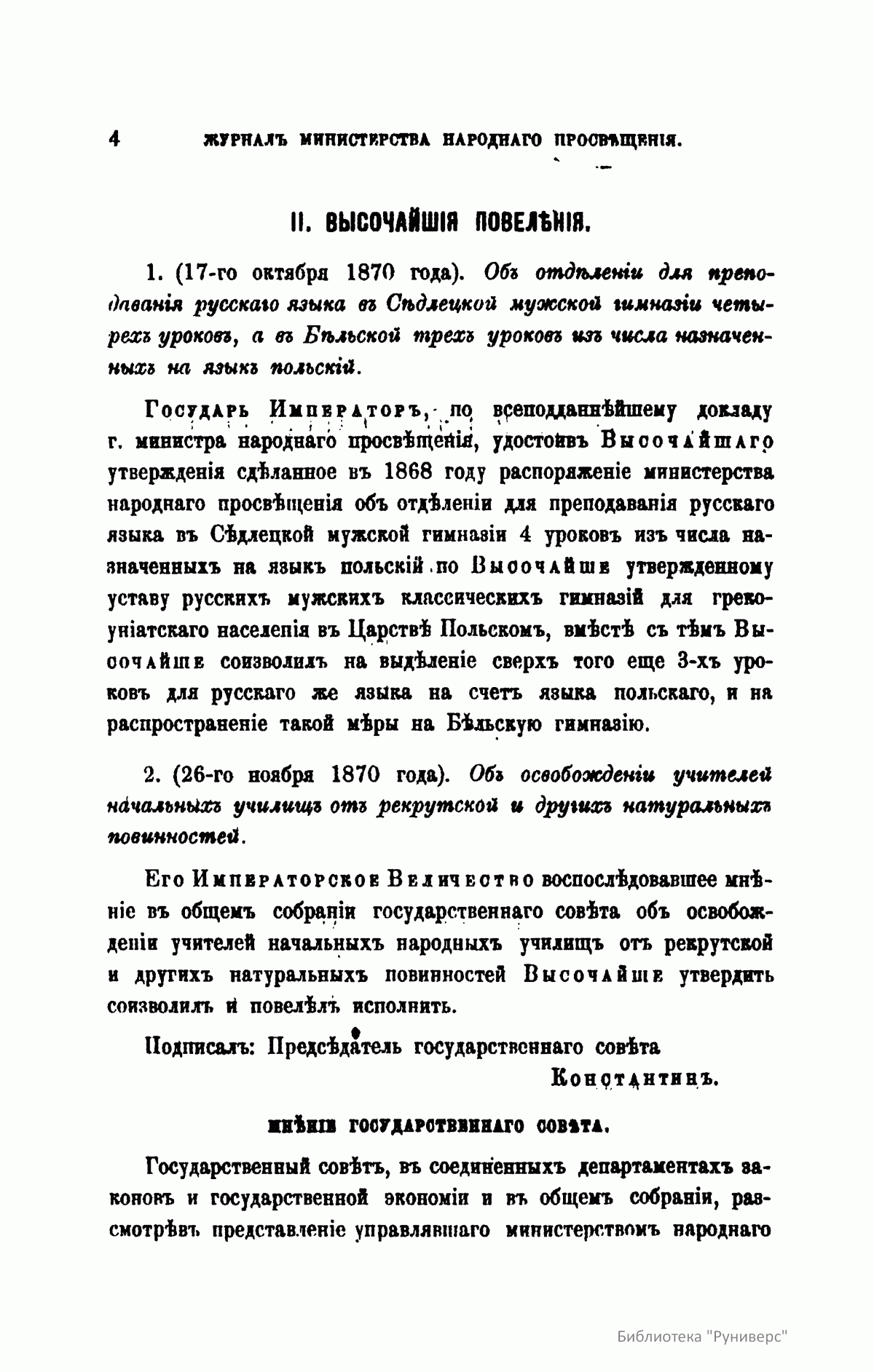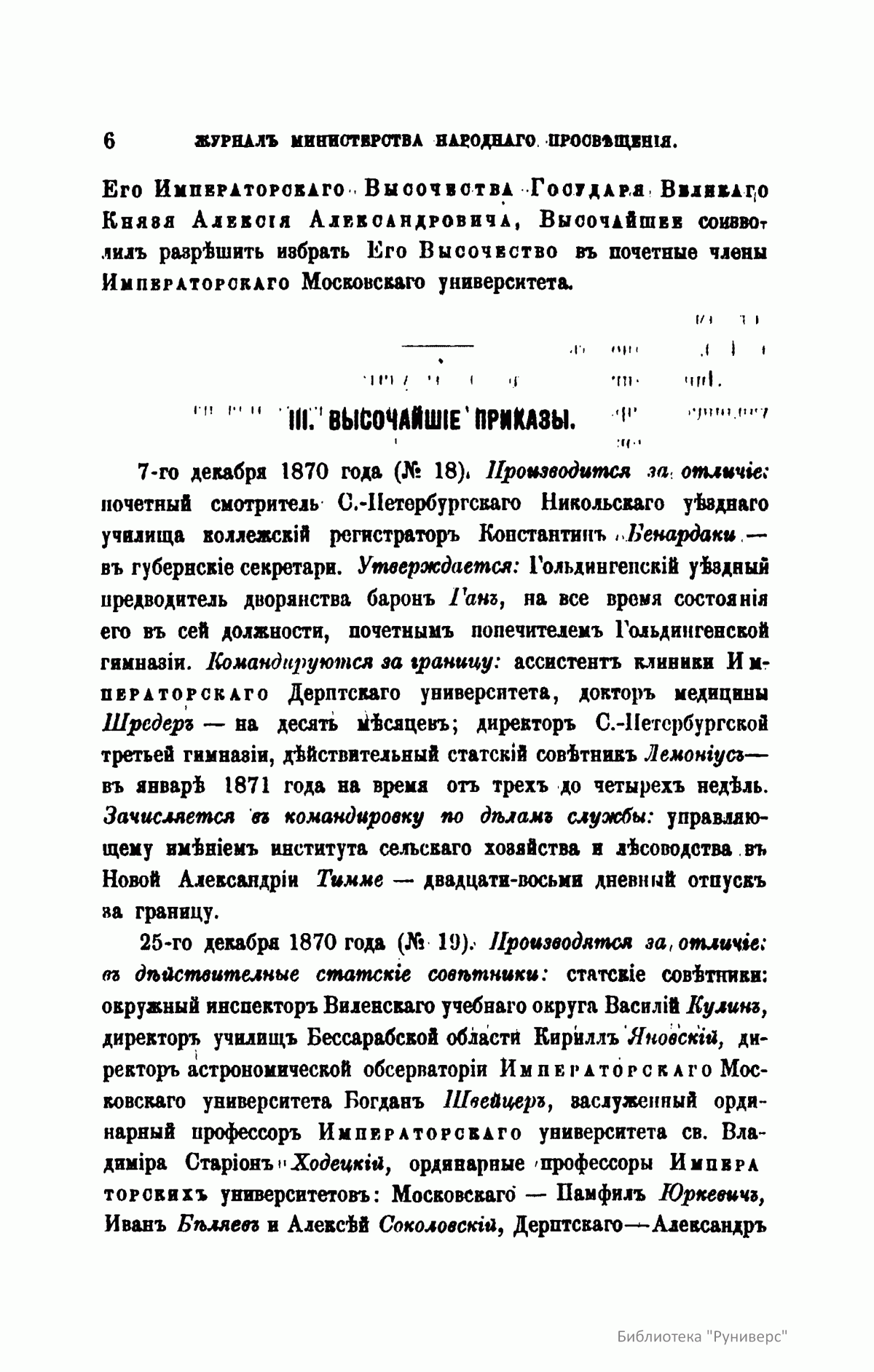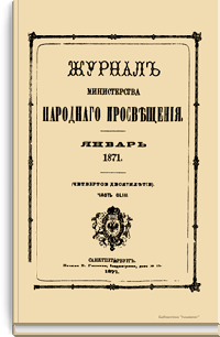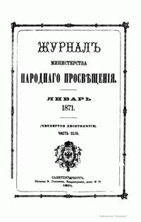 Журнал Министерства народного просвещения выходил с 1834-го по 1917 год. Официальный периодический журнал об успехах просвещения в России. Издатели журнала уверены в том, что «если для каждого человека необходим выход из грубой тьмы невежества и беспрерывное дальнейшее движение к свету, то для народов необходимо попечительное участие правительства в образовании. Только правительство имеет все средства знать и высоту успехов всемирного образования, и настоящие нужды Отечества».
