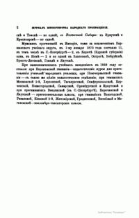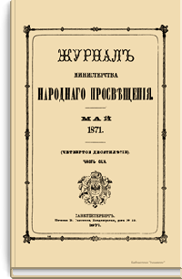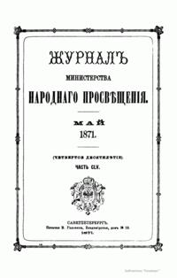 Журнал Министерства народного просвещения выходил с 1834-го по 1917 год. Официальный периодический журнал об успехах просвещения в России. Издатели журнала уверены в том, что «если для каждого человека необходим выход из грубой тьмы невежества и беспрерывное дальнейшее движение к свету, то для народов необходимо попечительное участие правительства в образовании. Только правительство имеет все средства знать и высоту успехов всемирного образования, и настоящие нужды Отечества».