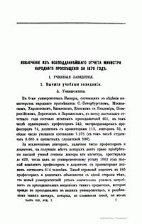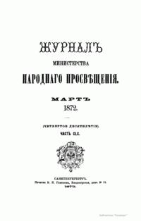 Журнал Министерства народного просвещения выходил с 1834-го по 1917 год. Официальный периодический журнал об успехах просвещения в России. Издатели журнала уверены в том, что «если для каждого человека необходим выход из грубой тьмы невежества и беспрерывное дальнейшее движение к свету, то для народов необходимо попечительное участие правительства в образовании. Только правительство имеет все средства знать и высоту успехов всемирного образования, и настоящие нужды Отечества».