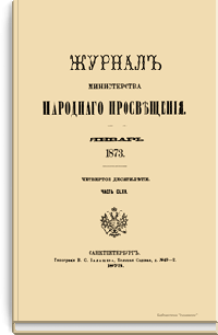 Журнал Министерства народного просвещения выходил с 1834-го по 1917 год. Официальный периодический журнал об успехах просвещения в России. Издатели журнала уверены в том, что «если для каждого человека необходим выход из грубой тьмы невежества и беспрерывное дальнейшее движение к свету, то для народов необходимо попечительное участие правительства в образовании. Только правительство имеет все средства знать и высоту успехов всемирного образования, и настоящие нужды Отечества».