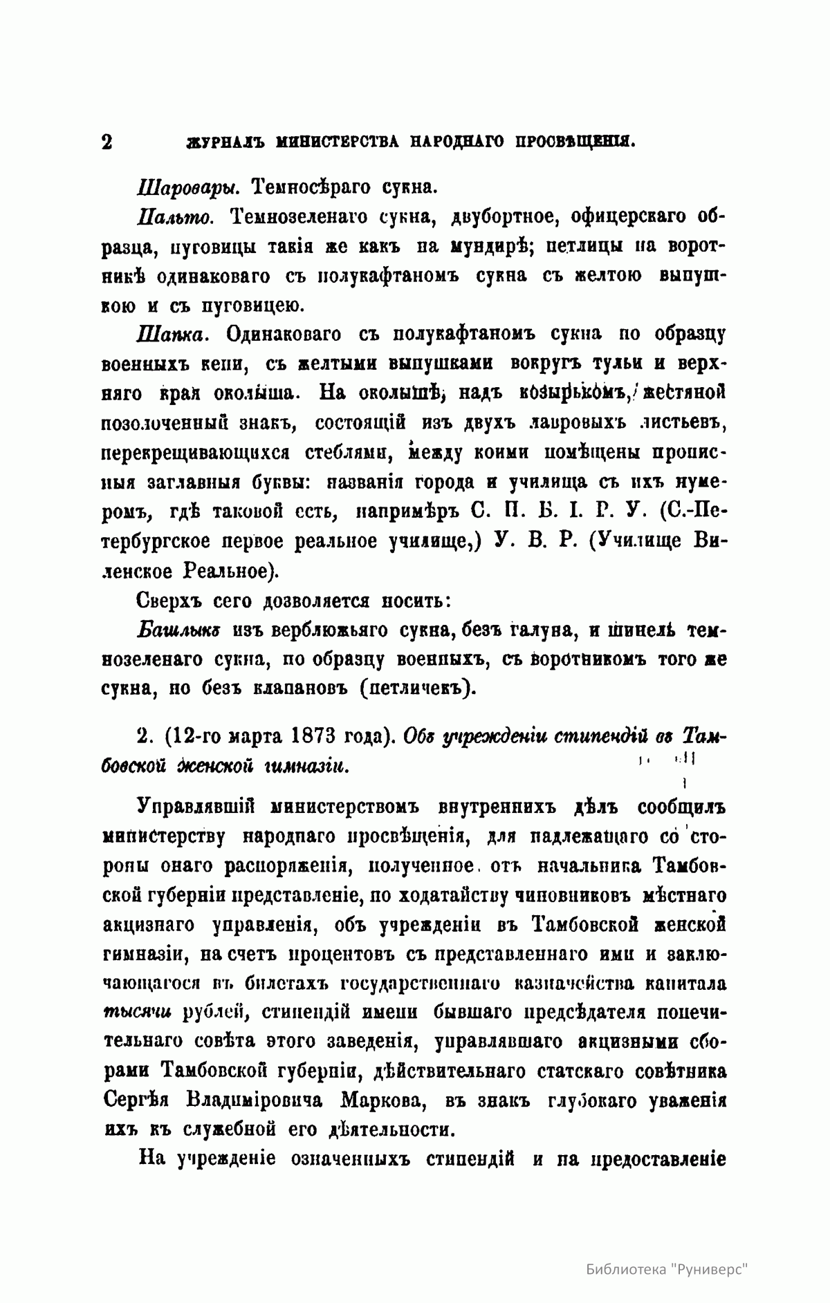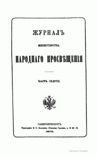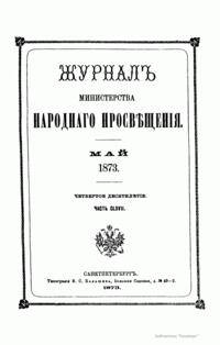 Журнал Министерства народного просвещения выходил с 1834-го по 1917 год. Официальный периодический журнал об успехах просвещения в России. Издатели журнала уверены в том, что «если для каждого человека необходим выход из грубой тьмы невежества и беспрерывное дальнейшее движение к свету, то для народов необходимо попечительное участие правительства в образовании. Только правительство имеет все средства знать и высоту успехов всемирного образования, и настоящие нужды Отечества».