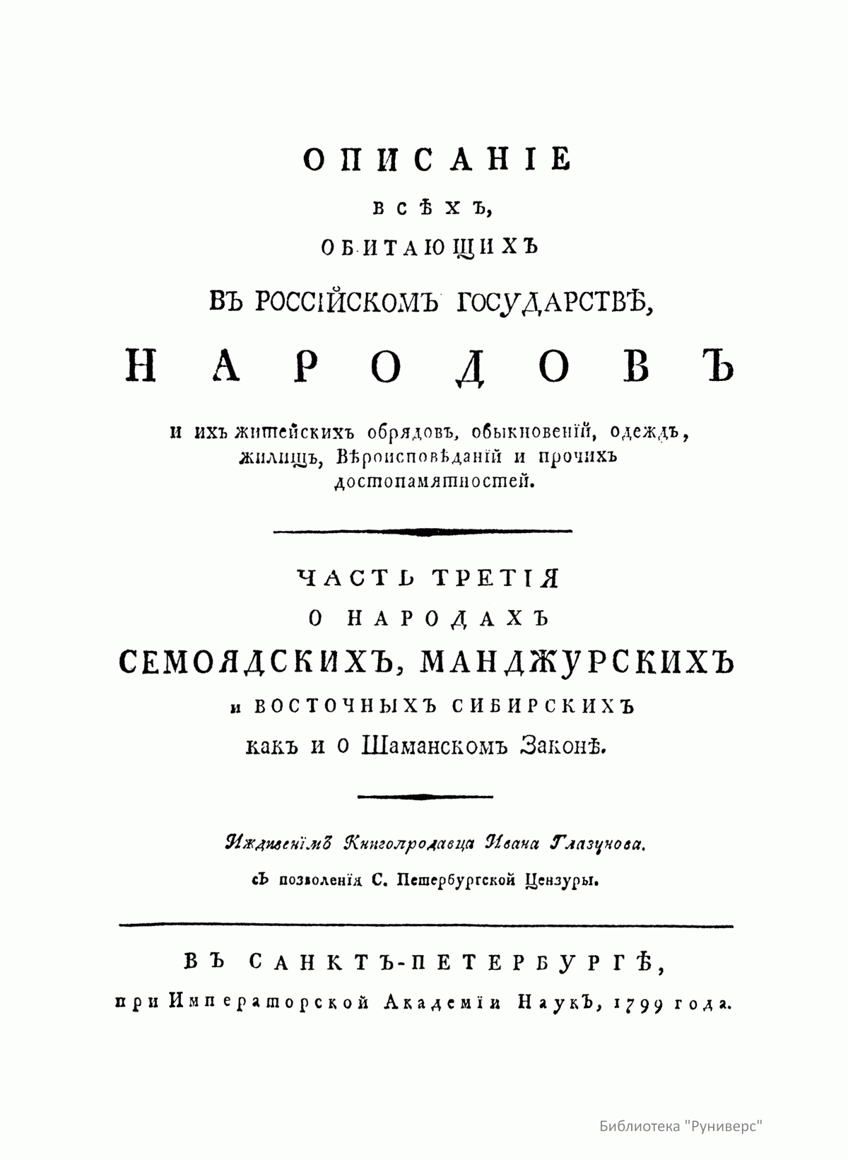 Описанiе всѣхъ обитающихъ въ Россiйскомъ государствѣ народовъ. Ихъ житейскихъ обрядовъ, обыкновенiй, одеждъ, жилищъ, упражненiй, забавъ, вѣроисповѣданiй и другихъ достопамятностей. Часть третiя о народахъ семоядскихъ, манджурскихъ и восточныхъ сибирскихъ какъ и о Шаманскомъ законѣ