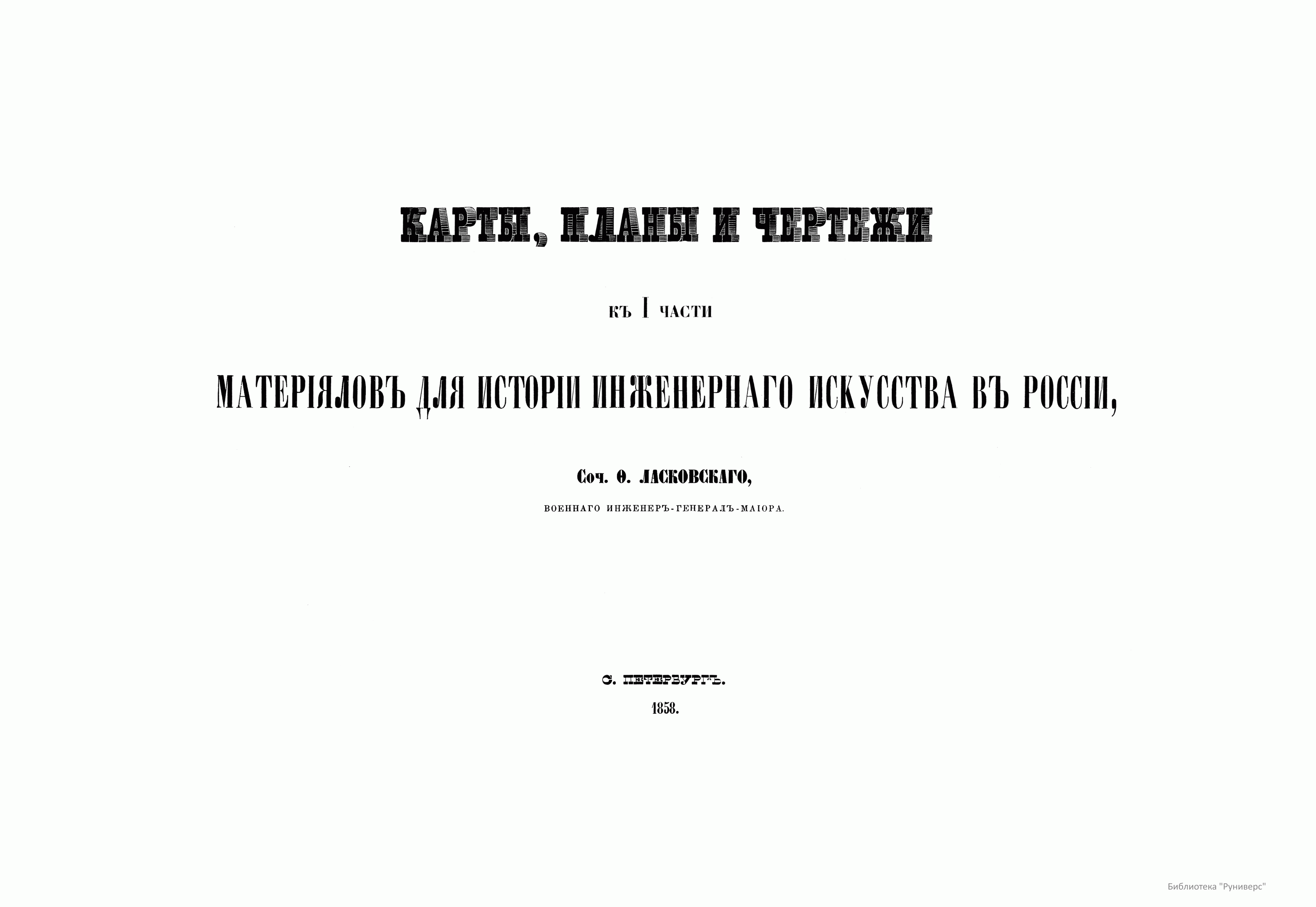 «Материалы для истории инженерного искусства в России» — прижизненное издание заслуженного профессора Николаевской инженерной академии генерал-лейтенанта Федора Федоровича Ласковского (1801–1870). Окончив курс Главного инженерного училища в 1822 г., он занимал там же кафедру фортификации, кроме того, был профессором фортификации в Академии Генерального штаба и преподавателем наследника цесаревича Александра Николаевича, великих князей Николая, Константина и Михаила и принца Петра Георгиевича Ольденбургского. Первая часть издания — «Опыт исследования инженерного дела в России до XVIII столетия» — содержит описание и критическое исследование оборонительных оград, рассматривается вопрос укрепленных монастырей и их значение в системе обороны России, отдельные главы посвящены атаке и обороне укрепленных городов, военным строителям. Также присутствуют пояснения к чертежам, указатель технических названий по инженерной и артиллерийской частям, географический указатель к тексту и чертежам. Вторая часть — «Опыт исследования инженерного искусства в царствование императора Петра Великого» — включает описание войн с Турцией и Швецией, осад городов, повествует об образовании корпуса инженеров, системе обороны границ, способах укреплений, полевых окопах. Дополнения содержат летопись об осадах, не вошедших в общее исследование, журналы обороны и пр. В приложениях — табели о составе инженеров, извлечения из воинского устава о значении инженерных чинов. Третья часть «Материалов…» — «Опыт исследования инженерного искусства после императора Петра I до императрицы Екатерины II» — повествует о пограничных линиях, крепостных сооружениях, полевых и временных укреплениях, переправах и военных мостах, осадном искусстве. В приложениях содержатся пояснения к чертежам, хронологический указатель наиболее замечательных событий по инженерной части, географический указатель к тексту и чертежам. Карты, планы и чертежи к «Материалам для истории инженерного искусства в России» содержат планы городов, их оборонительных оград и башен, кремлей, крепостей и укреплений, общие планы атак и осад, укрепленных пунктов, бастионов, редут, батарей, замков, внутренних и внешних построек крепостей и кремлей. При составлении книги автор использовал много графических материалов из архивов Инженерного и Военно-топографического депо, отечественные летописи, официальные акты, записки иностранцев о России, специальные издания из частных и общественных библиотек, а также различные другие источники, что делает это произведение истинным памятником в области военной инженерии.