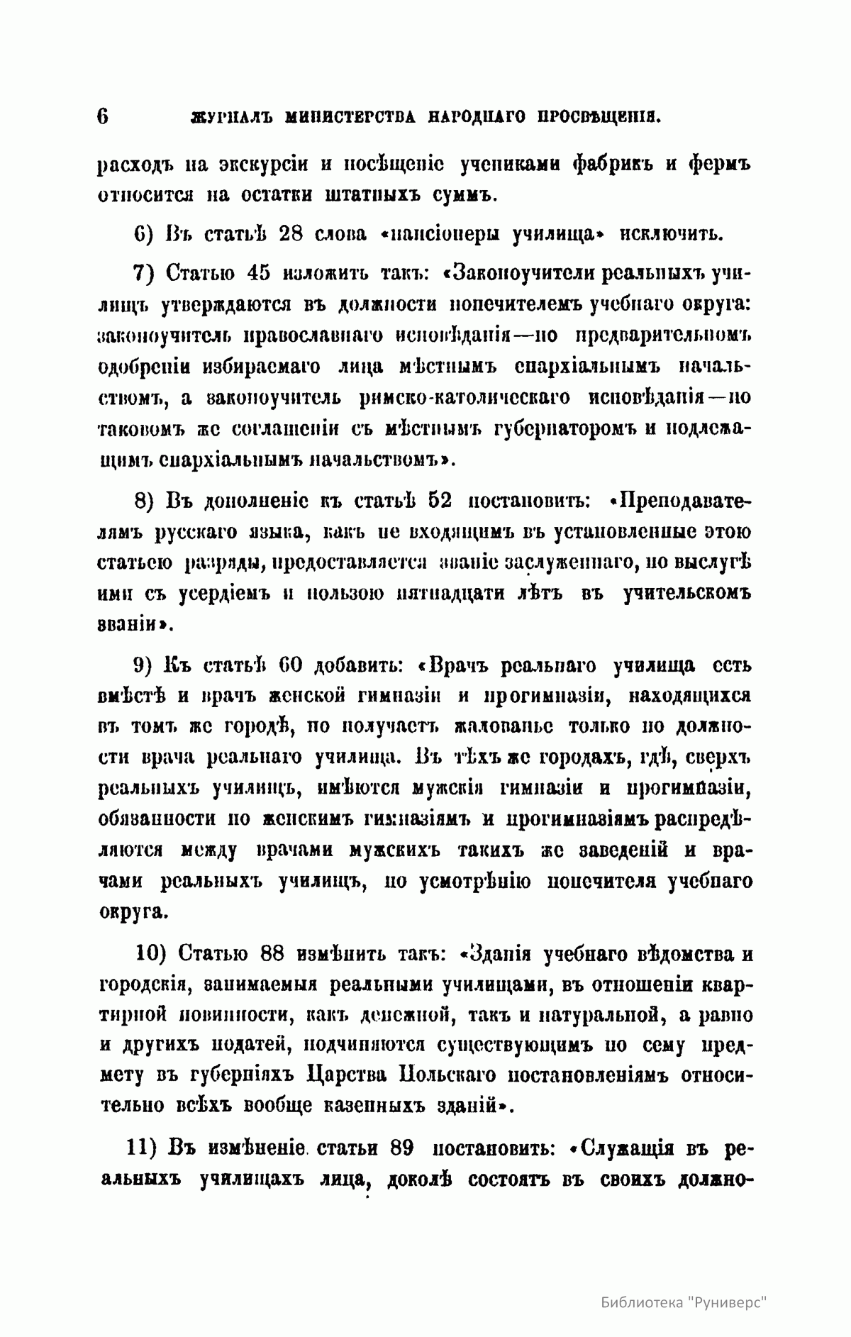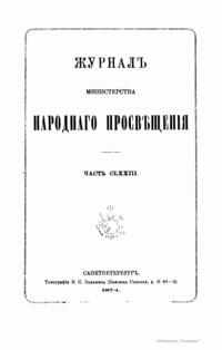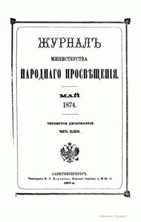 Журнал Министерства народного просвещения выходил с 1834-го по 1917 год. Официальный периодический журнал об успехах просвещения в России. Издатели журнала уверены в том, что «если для каждого человека необходим выход из грубой тьмы невежества и беспрерывное дальнейшее движение к свету, то для народов необходимо попечительное участие правительства в образовании. Только правительство имеет все средства знать и высоту успехов всемирного образования, и настоящие нужды Отечества».