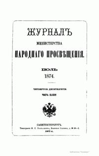 Журнал Министерства народного просвещения выходил с 1834-го по 1917 год. Официальный периодический журнал об успехах просвещения в России. Издатели журнала уверены в том, что «если для каждого человека необходим выход из грубой тьмы невежества и беспрерывное дальнейшее движение к свету, то для народов необходимо попечительное участие правительства в образовании. Только правительство имеет все средства знать и высоту успехов всемирного образования, и настоящие нужды Отечества».