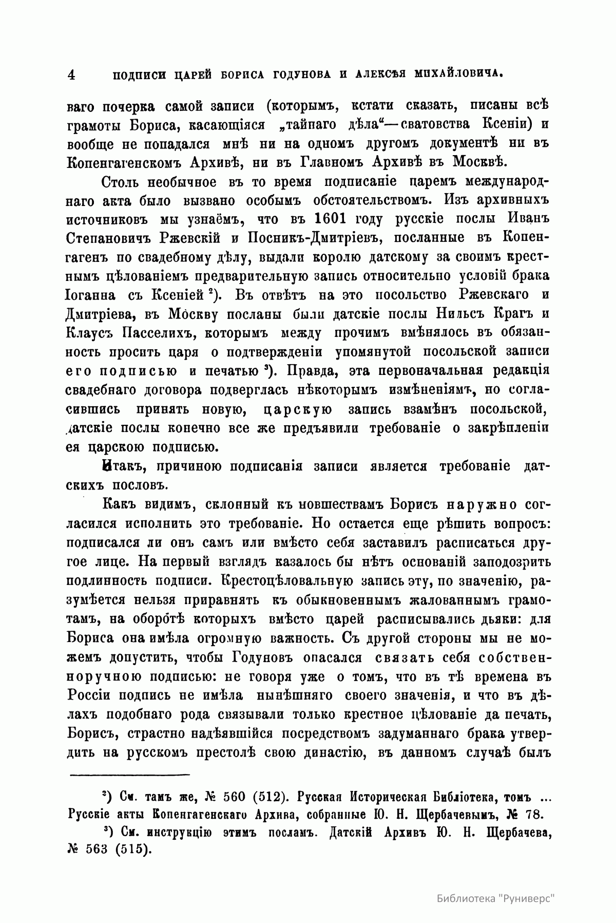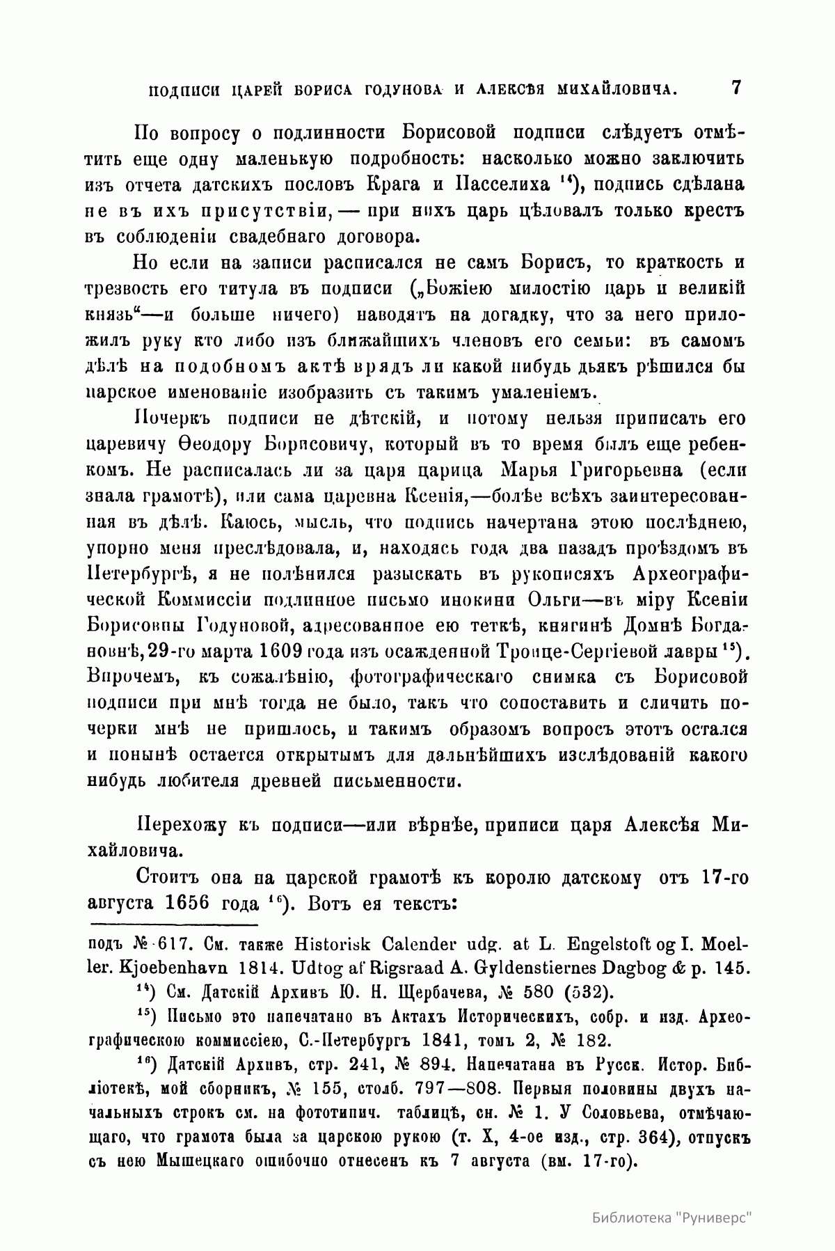 В настоящей статье автор решает вопрос о подлинности подписей царей Бориса Годунова и Алексея Михайловича на двух адресованных датским королям грамотах из Копенгагенского государственного архива. Этот вопрос представляет интерес, так как известно, что до Петра русские цари не подписывались под своими грамотами к иностранным государям – в те времена подпись не имела решающего значения, ценились крестное целование и печать. Автор представляет аргументированные доказательства того факта, что за Бориса Годунова подписалось другое лицо, а припись царя Алексея Михайловича является подлинной. В конце статьи представлены фото исследуемых подписей.