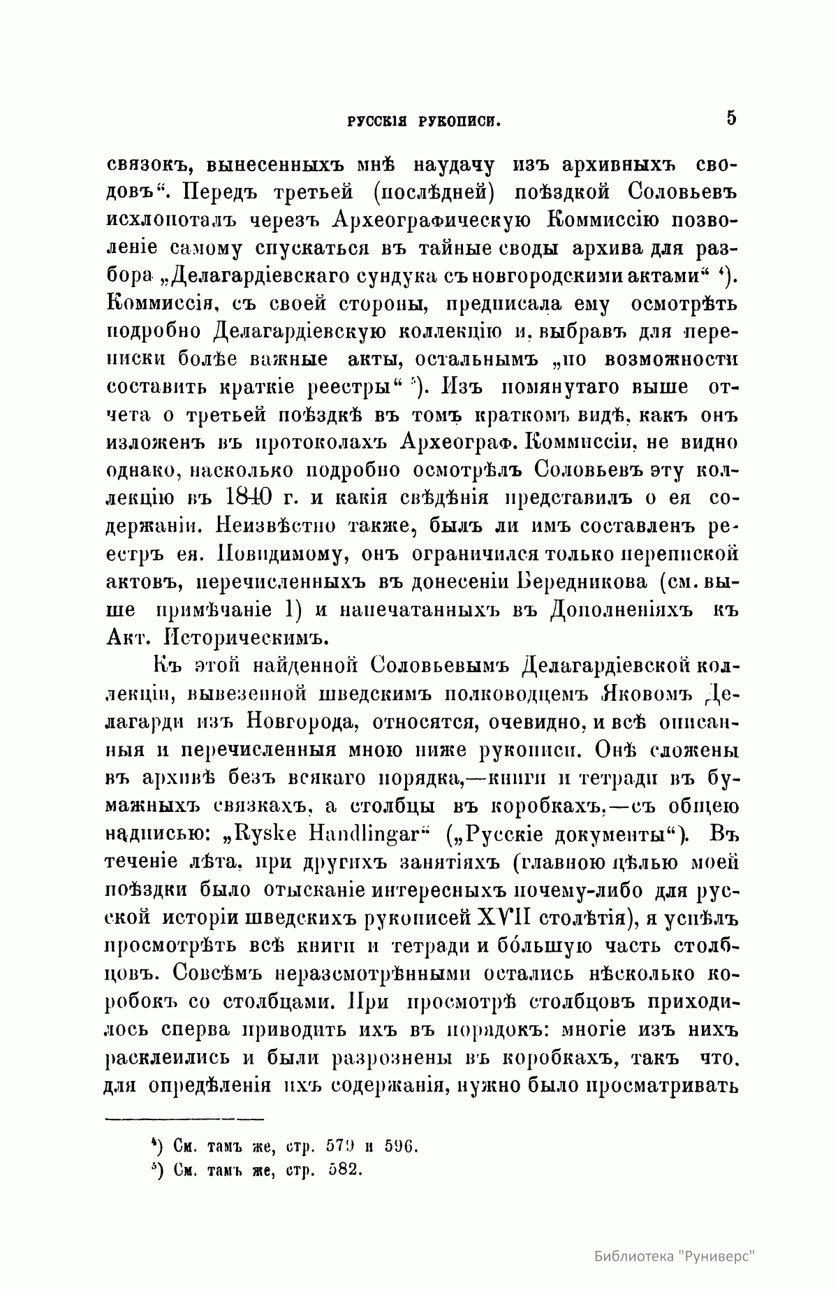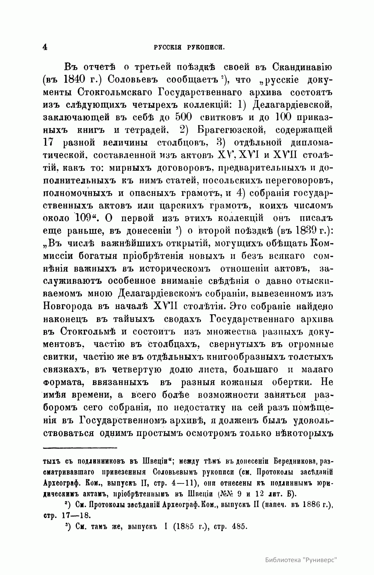 Русские документы Стокгольмского государственного архива на 1885 год состояли из четырех коллекций: делагардиевской (Яков Делагарди – шведский полководец, вывезший документы из Новгорода в начале XVII столетия), заключавшей до 500 свитков и до ста приказных книг и тетрадей; брагегюзской, содержавшей 17 разной величины столбцов; дипломатической, составленной из актов XV, XVI и XVII столетий; собрания 109 государственных актов и царских грамот. Эта коллекция в то время полностью не была систематизирована и описана. Документы настоящей публикации относятся к коллекции Делагарди. Здесь описано 47 столбцов (стр.12), и 118 приказных книг и тетрадей (стр. 41). В приложении к описанию столбцов (стр. 26) дается текст 19 грамот.