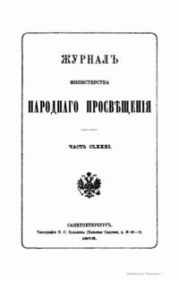 Журнал Министерства народного просвещения выходил с 1834-го по 1917 год. Официальный периодический журнал об успехах просвещения в России. Издатели журнала уверены в том, что «если для каждого человека необходим выход из грубой тьмы невежества и беспрерывное дальнейшее движение к свету, то для народов необходимо попечительное участие правительства в образовании. Только правительство имеет все средства знать и высоту успехов всемирного образования, и настоящие нужды Отечества».