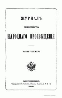 Журнал Министерства народного просвещения выходил с 1834-го по 1917 год. Официальный периодический журнал об успехах просвещения в России. Издатели журнала уверены в том, что «если для каждого человека необходим выход из грубой тьмы невежества и беспрерывное дальнейшее движение к свету, то для народов необходимо попечительное участие правительства в образовании. Только правительство имеет все средства знать и высоту успехов всемирного образования, и настоящие нужды Отечества».