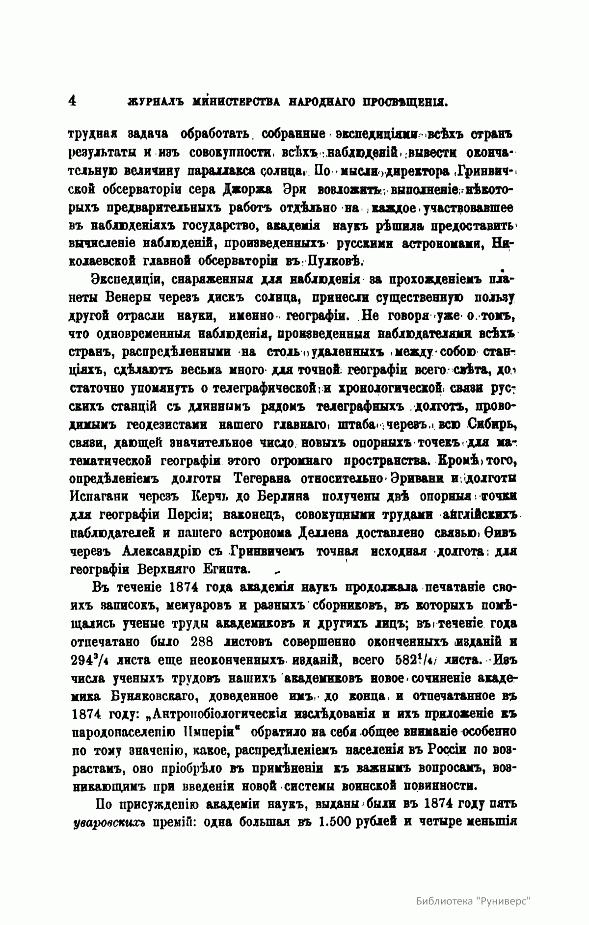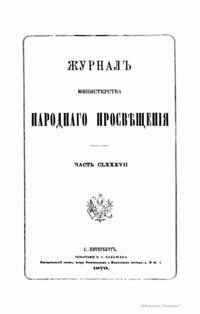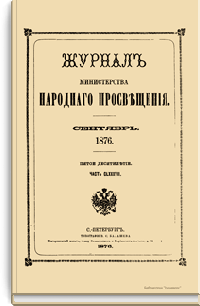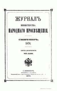 Журнал Министерства народного просвещения выходил с 1834-го по 1917 год. Официальный периодический журнал об успехах просвещения в России. Издатели журнала уверены в том, что «если для каждого человека необходим выход из грубой тьмы невежества и беспрерывное дальнейшее движение к свету, то для народов необходимо попечительное участие правительства в образовании. Только правительство имеет все средства знать и высоту успехов всемирного образования, и настоящие нужды Отечества».