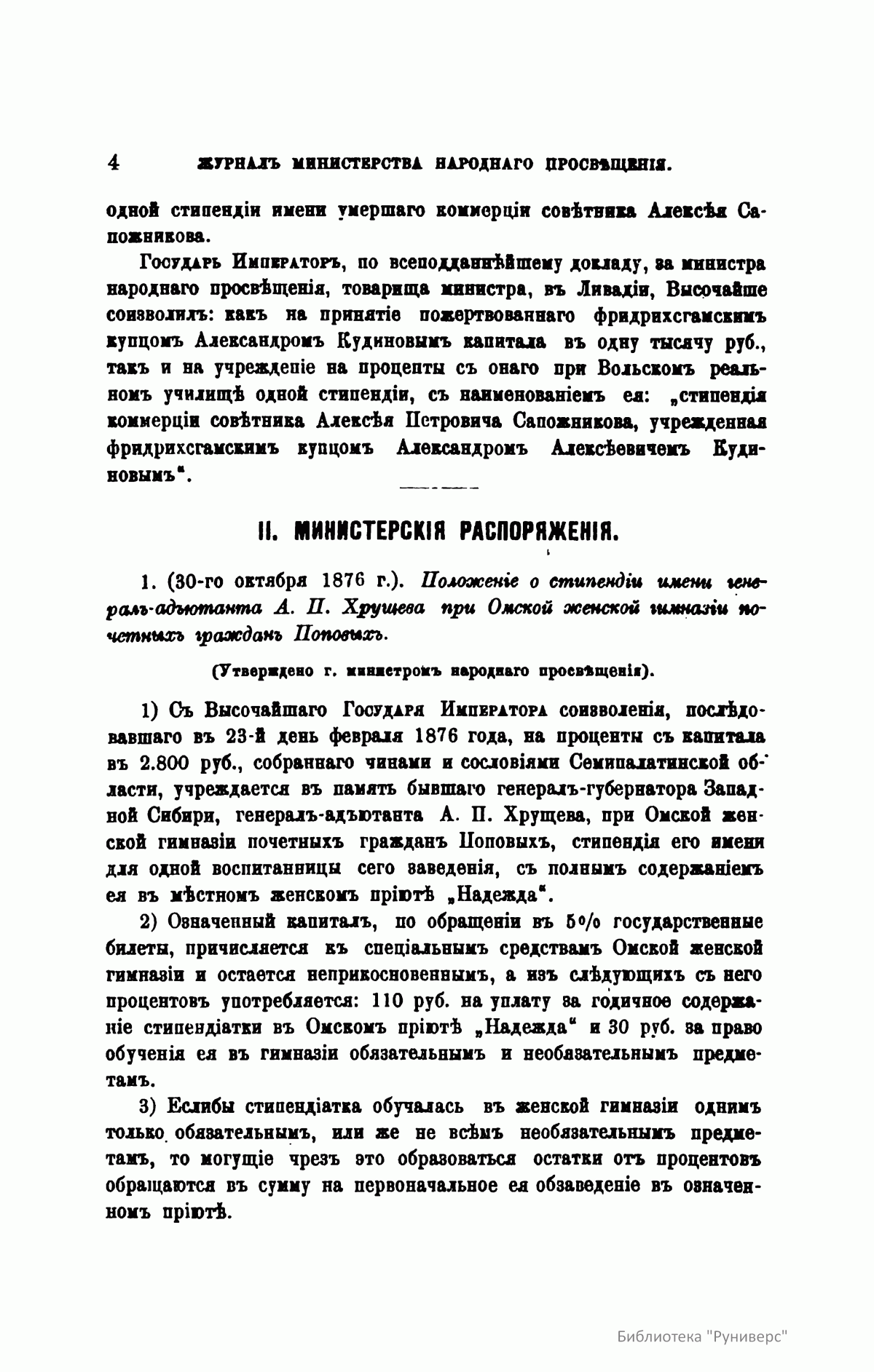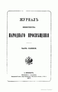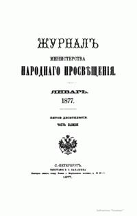 Журнал Министерства народного просвещения выходил с 1834-го по 1917 год. Официальный периодический журнал об успехах просвещения в России. Издатели журнала уверены в том, что «если для каждого человека необходим выход из грубой тьмы невежества и беспрерывное дальнейшее движение к свету, то для народов необходимо попечительное участие правительства в образовании. Только правительство имеет все средства знать и высоту успехов всемирного образования, и настоящие нужды Отечества».