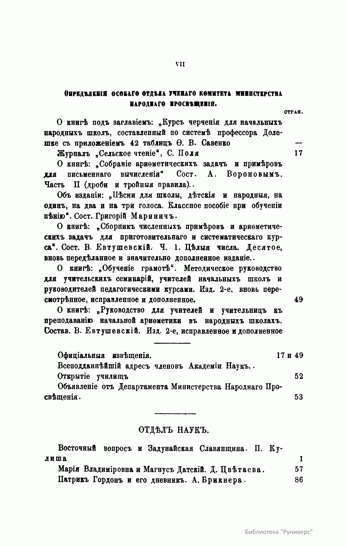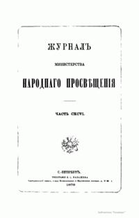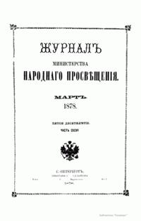 Журнал Министерства народного просвещения выходил с 1834-го по 1917 год. Официальный периодический журнал об успехах просвещения в России. Издатели журнала уверены в том, что «если для каждого человека необходим выход из грубой тьмы невежества и беспрерывное дальнейшее движение к свету, то для народов необходимо попечительное участие правительства в образовании. Только правительство имеет все средства знать и высоту успехов всемирного образования, и настоящие нужды Отечества».