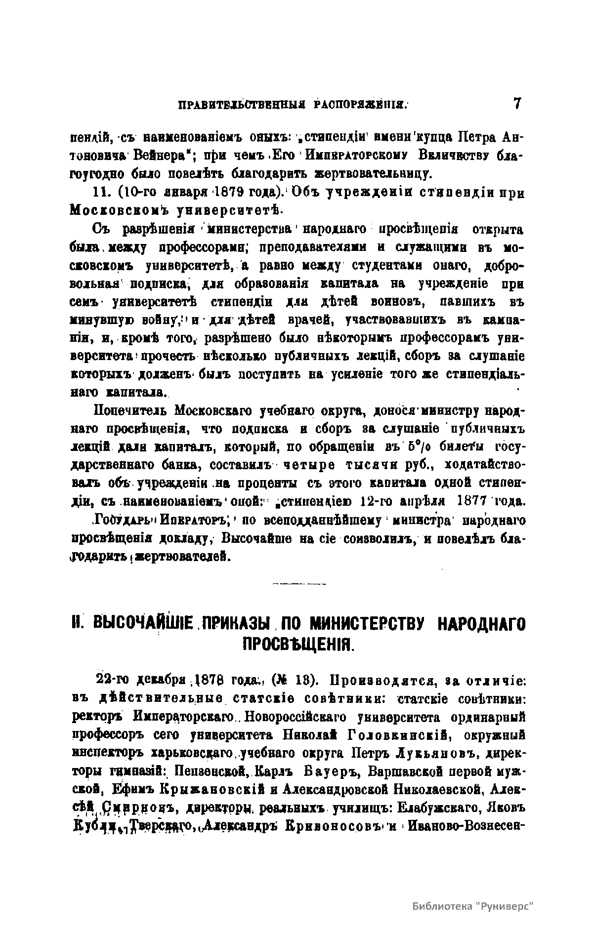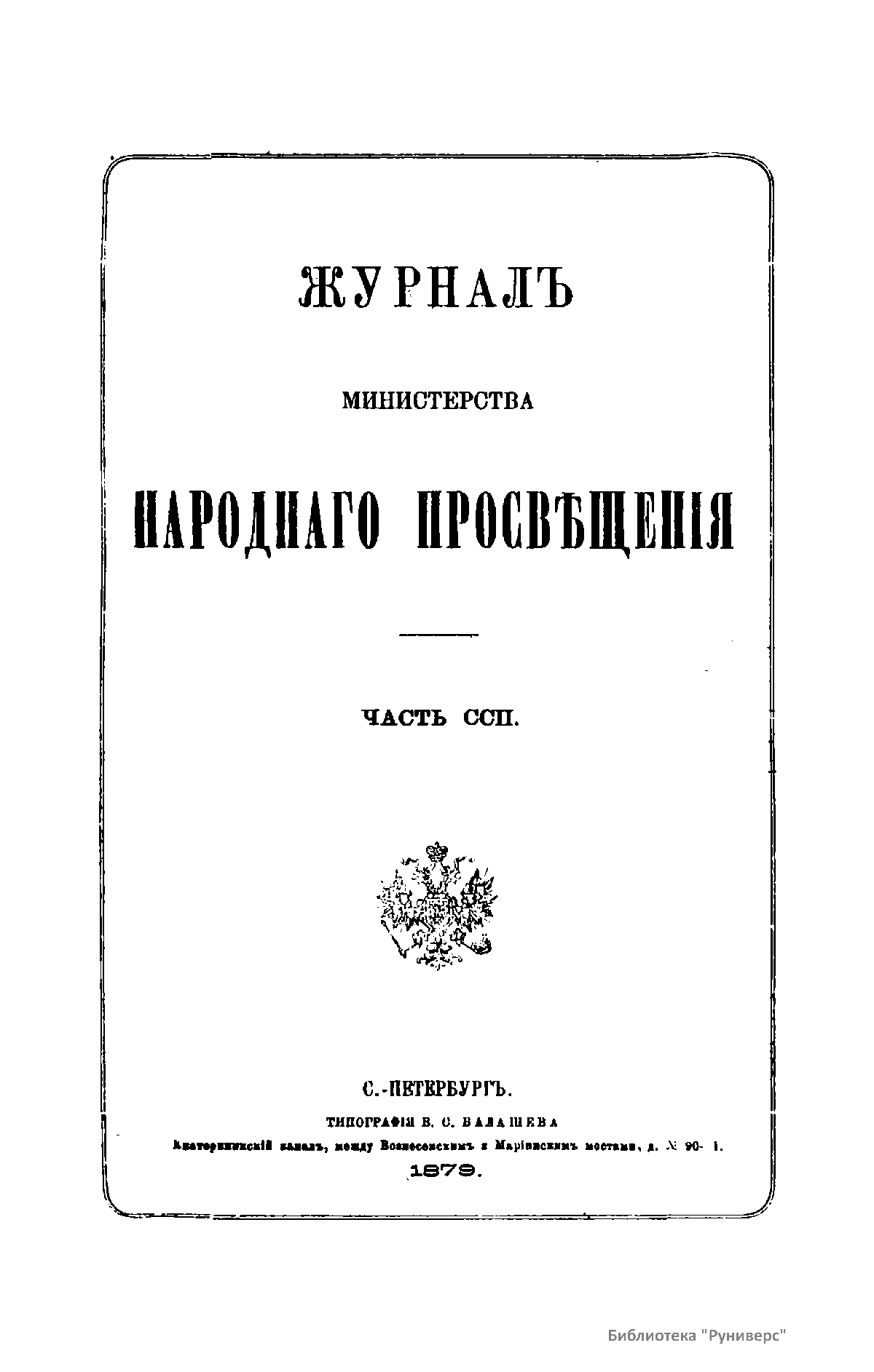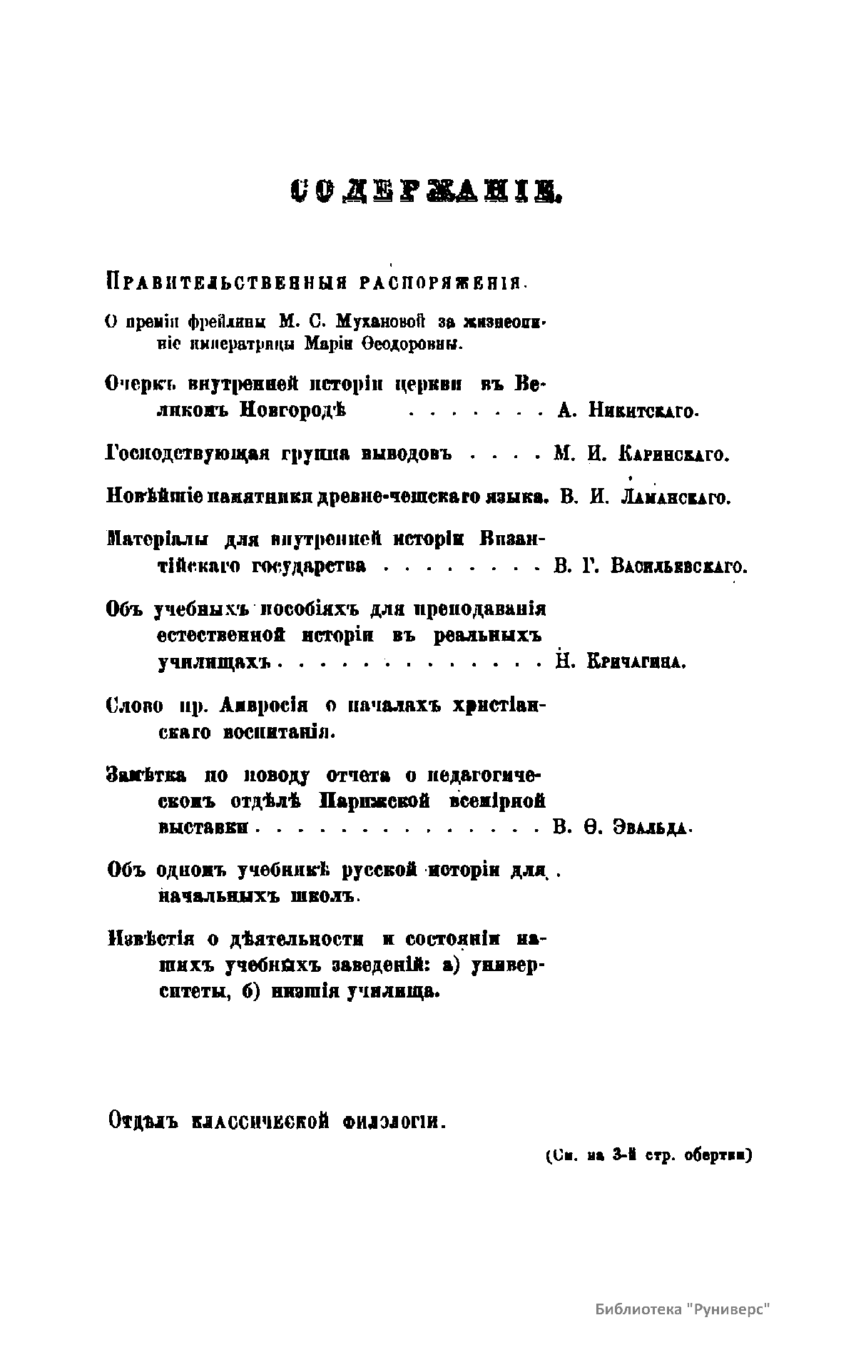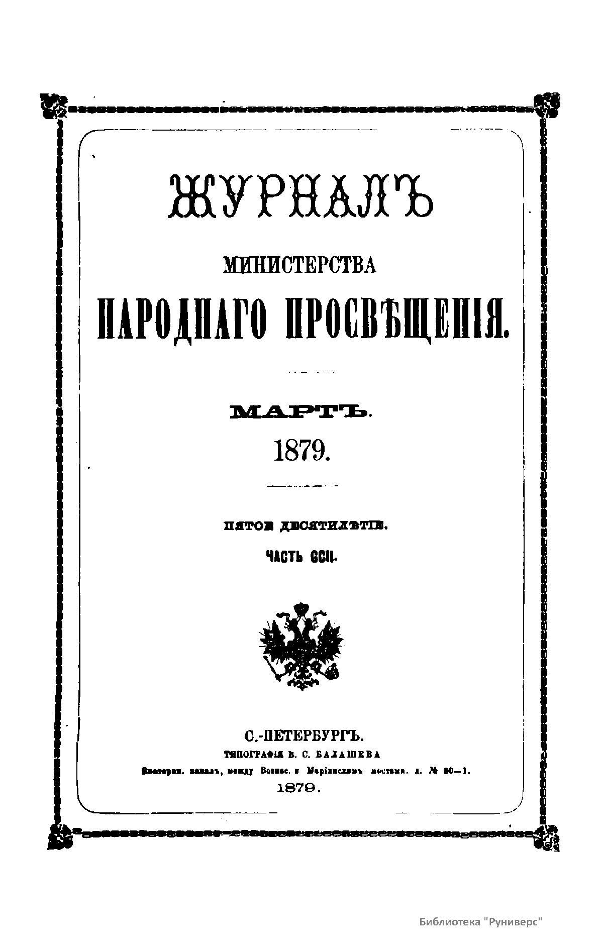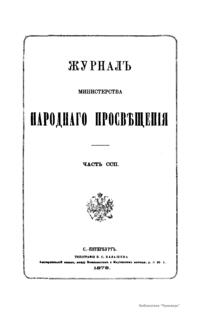 Журнал Министерства народного просвещения выходил с 1834-го по 1917 год. Официальный периодический журнал об успехах просвещения в России. Издатели журнала уверены в том, что «если для каждого человека необходим выход из грубой тьмы невежества и беспрерывное дальнейшее движение к свету, то для народов необходимо попечительное участие правительства в образовании. Только правительство имеет все средства знать и высоту успехов всемирного образования, и настоящие нужды Отечества».